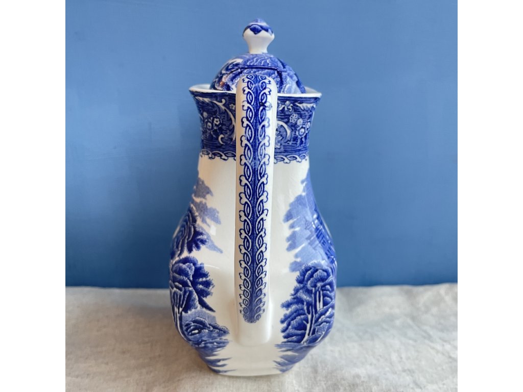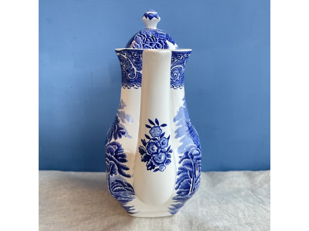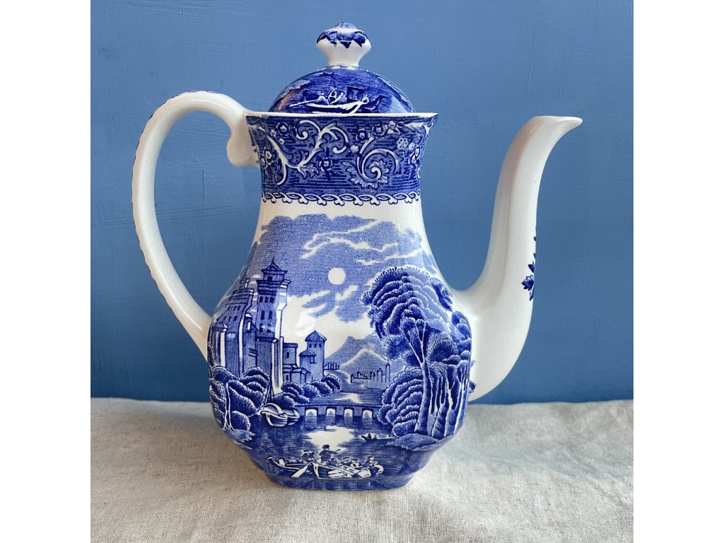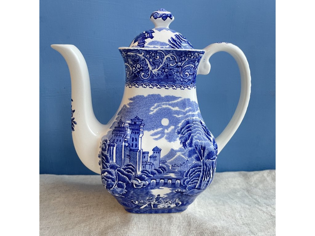 Porcelánová konvice je zdobena klasickým modrobílým dekorem River Scene, který patří k nejznámějším krajinovým motivům anglického přenosového tisku.