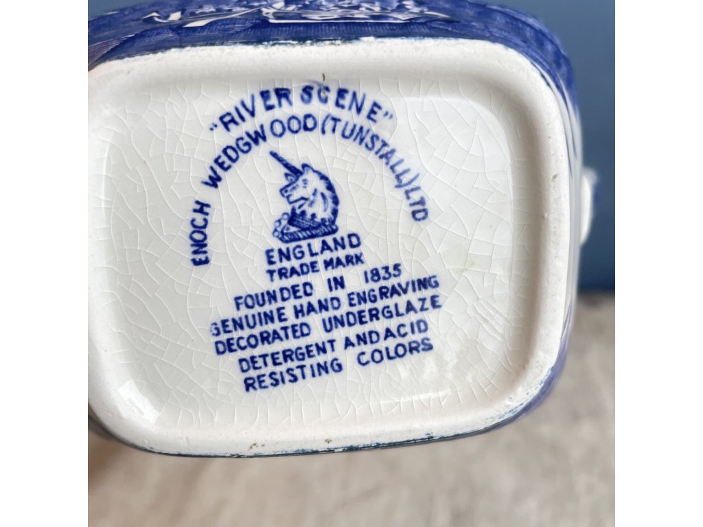 Spodní značení uvádí název dekoru „River Scene“, místo výroby Tunstall v Anglii a zdůrazňuje ručně rytý podglazurový dekor s barvami odolnými vůči detergentům a kyselinám.