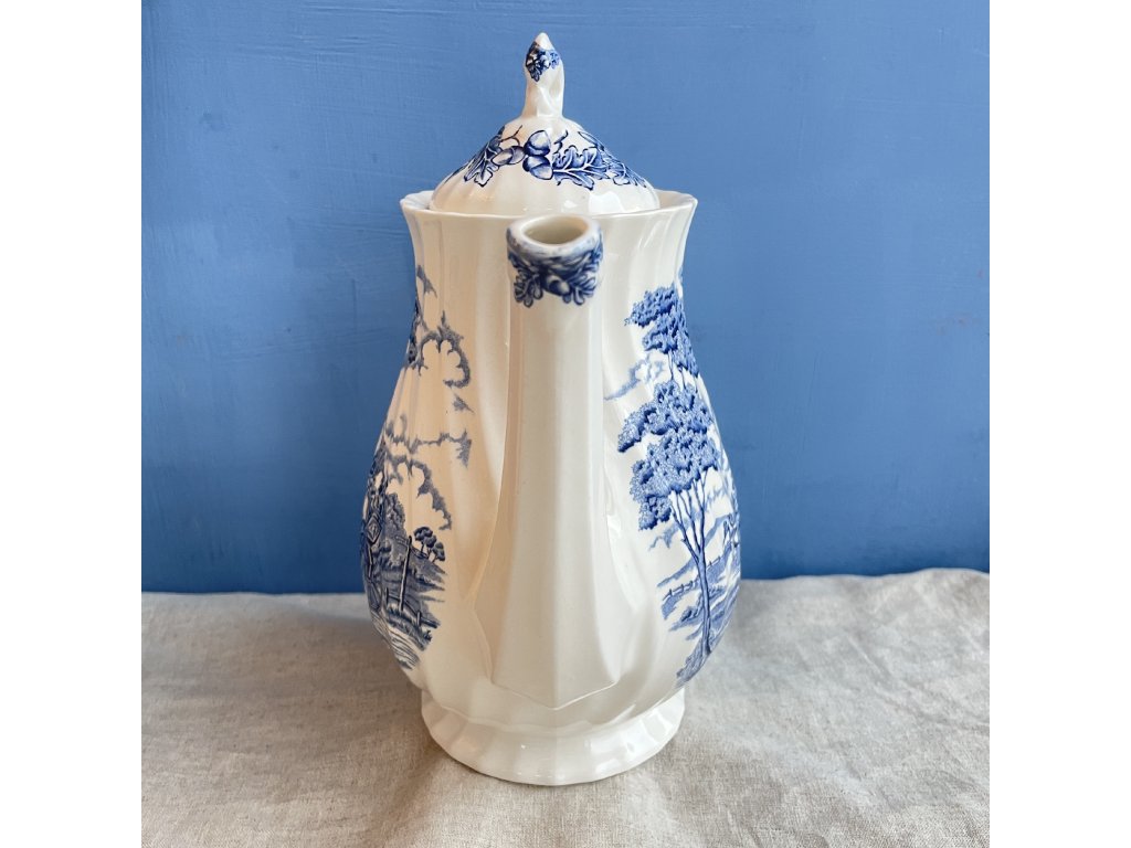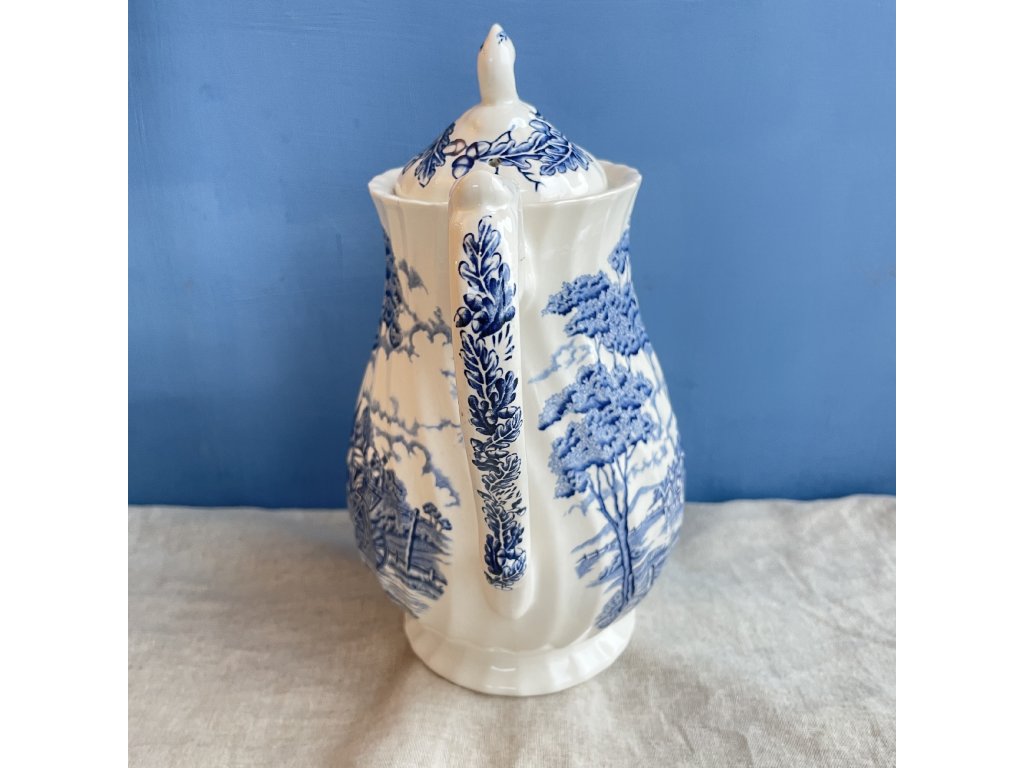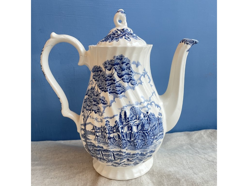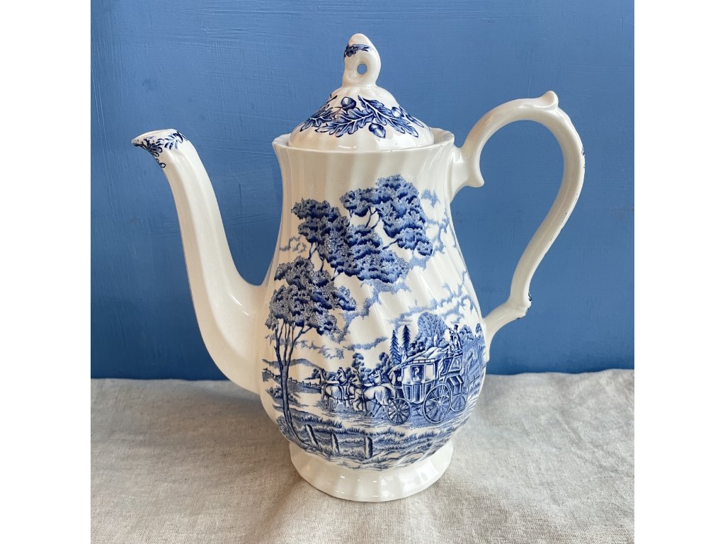 Elegantní porcelánová konvice je zdobena klasickým modrobílým krajinovým dekorem Royal Mail, který zobrazuje romantickou venkovskou scénu s dostavníkem taženým koňmi projíždějícím otevřenou krajinou se stromy, cestami a vzdálenými stavbami.