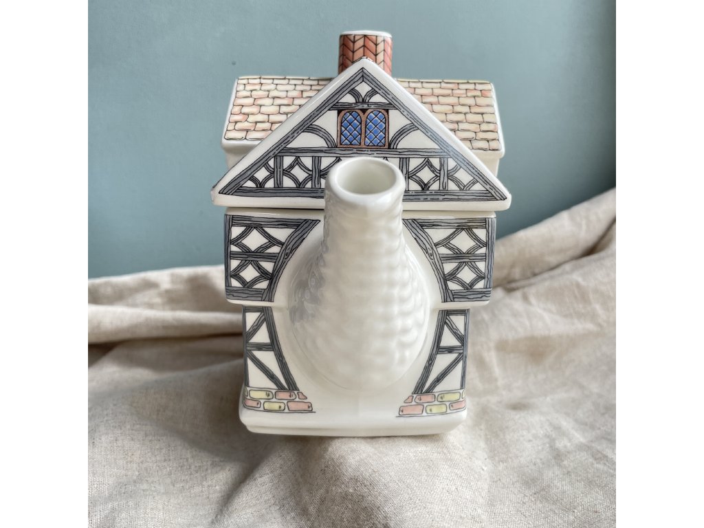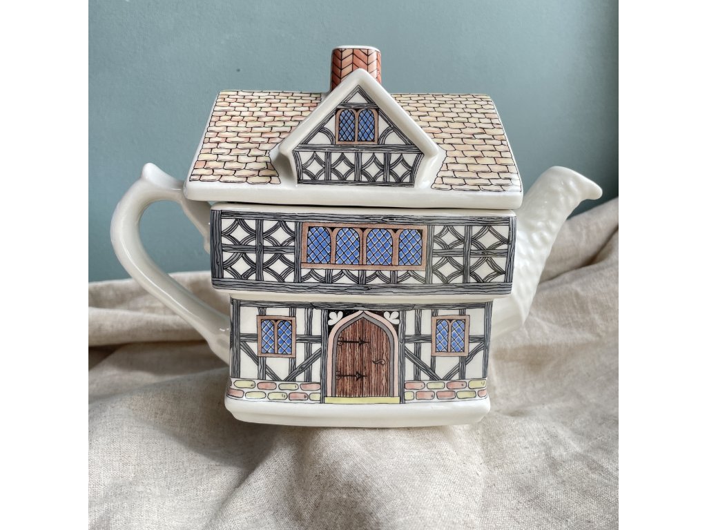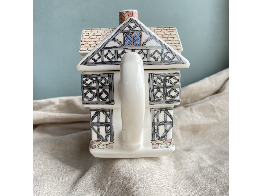 Keramická konvička na čaj má neobvyklý a dekorativní tvar anglického hrázděného domu z období Tudorovců.