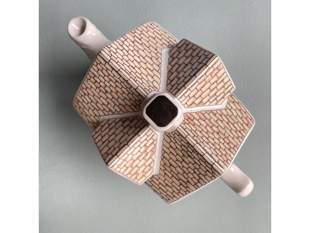 Tělo konvičky připomíná dvoupatrovou stavbu s typickými hrázděnými stěnami, šikmou střechou z glazovaných tašek a modrými olovnatými okny.