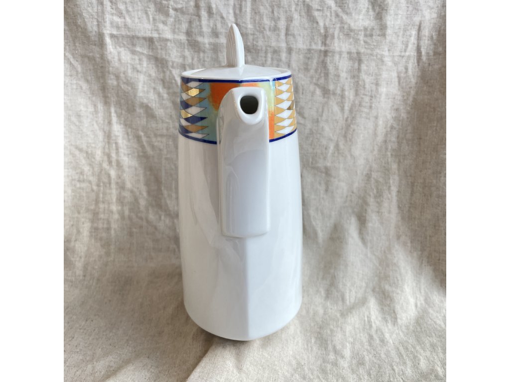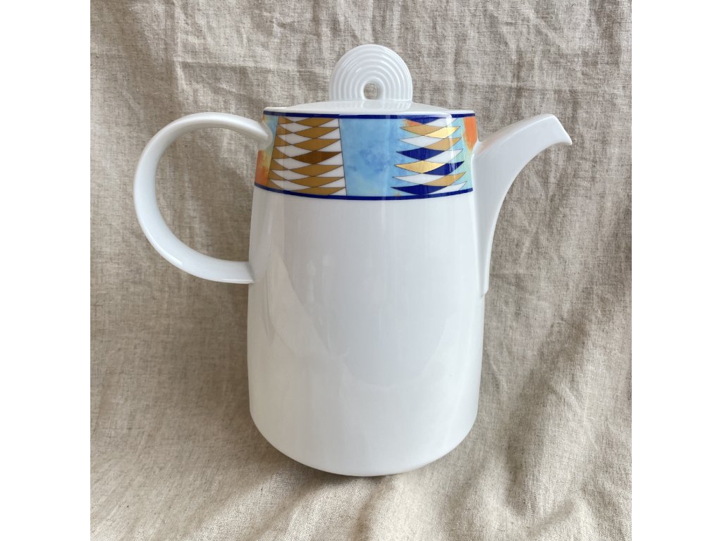 Porcelánová konvice značky Thomas Germany představuje elegantní příklad moderního německého designu s důrazem na jednoduché linie a geometrickou výzdobu.