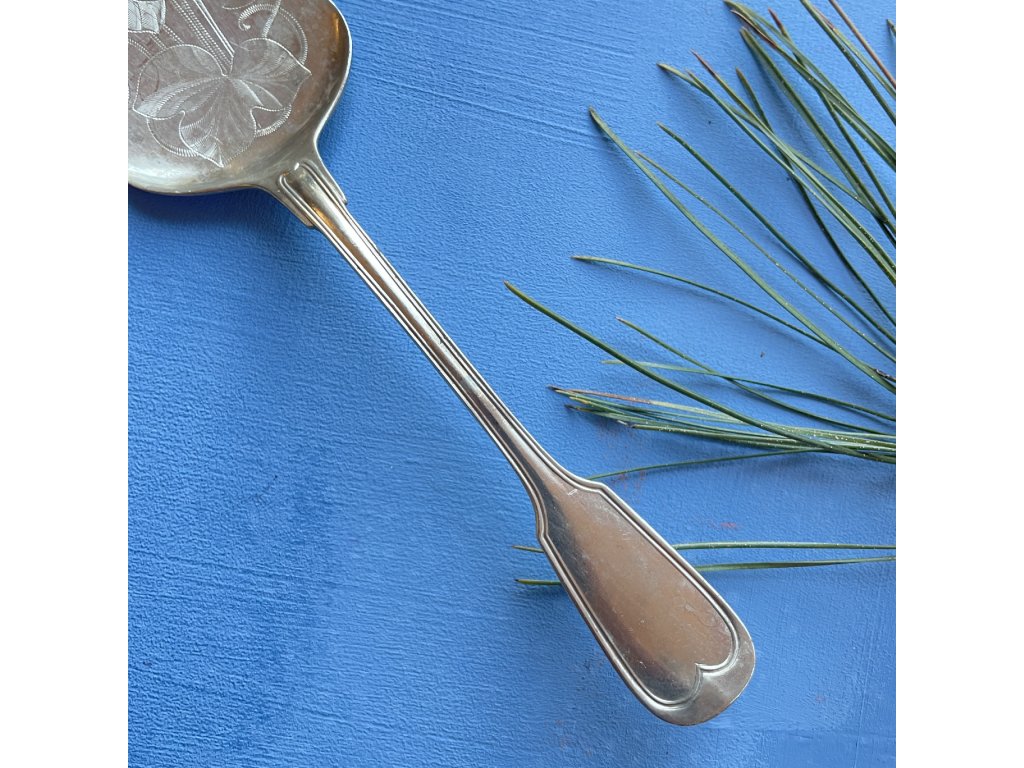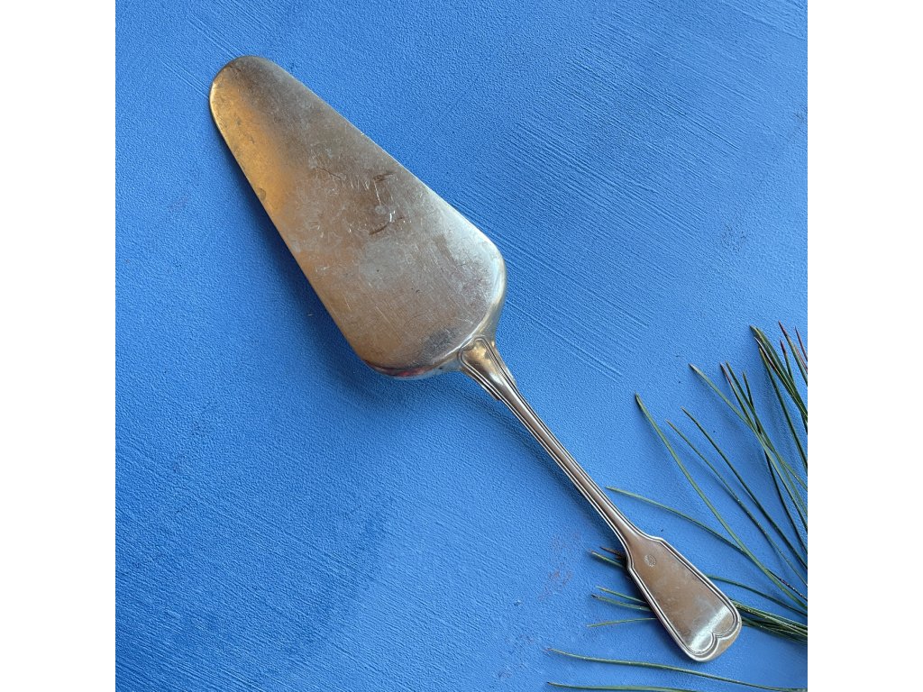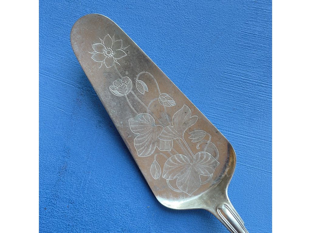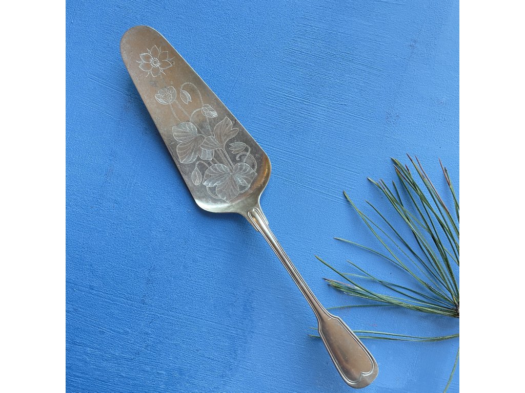 Elegantní kovová lopatka na dort s jemně gravírovaným květinovým motivem na čepeli.