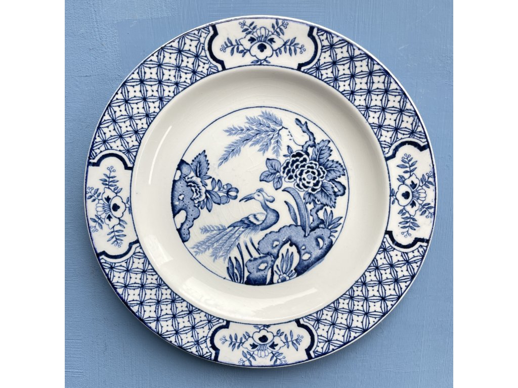 Dezertní talíř v tradičním modrobílém provedení, typickém pro anglickou keramickou produkci inspirovanou čínskými motivy.