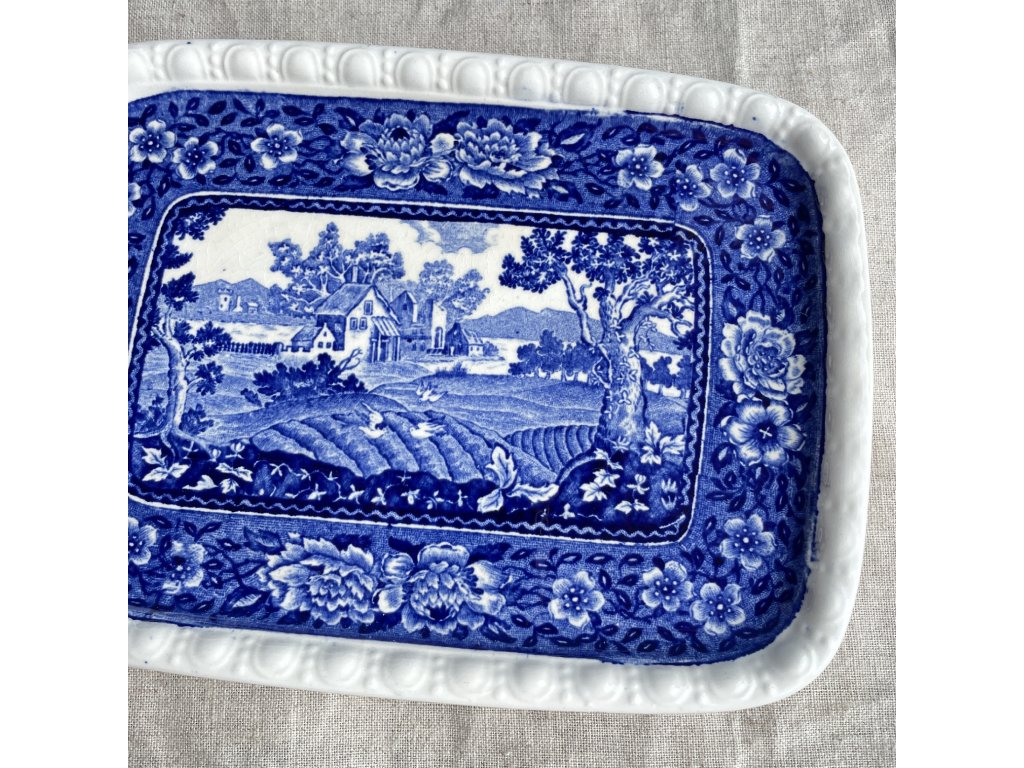 Střed podnosu vyplňuje jemně propracovaná venkovská krajina s domem, stromy, poli a drobnými figurálními detaily, působící jako malovaný obraz.