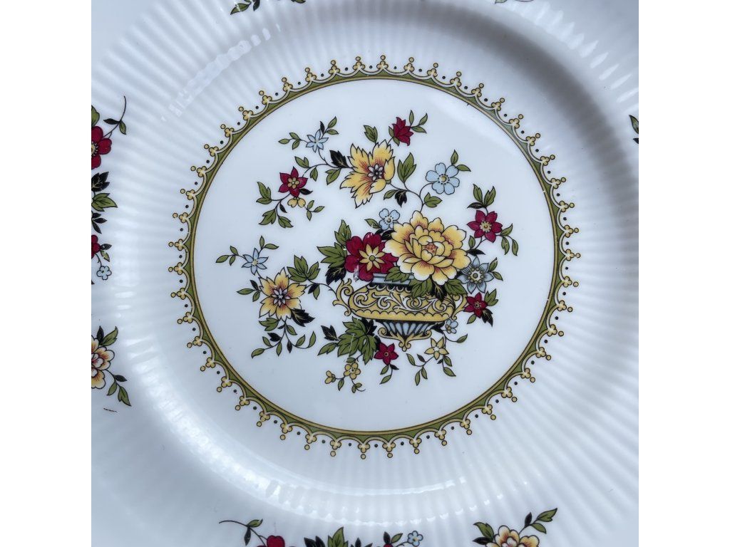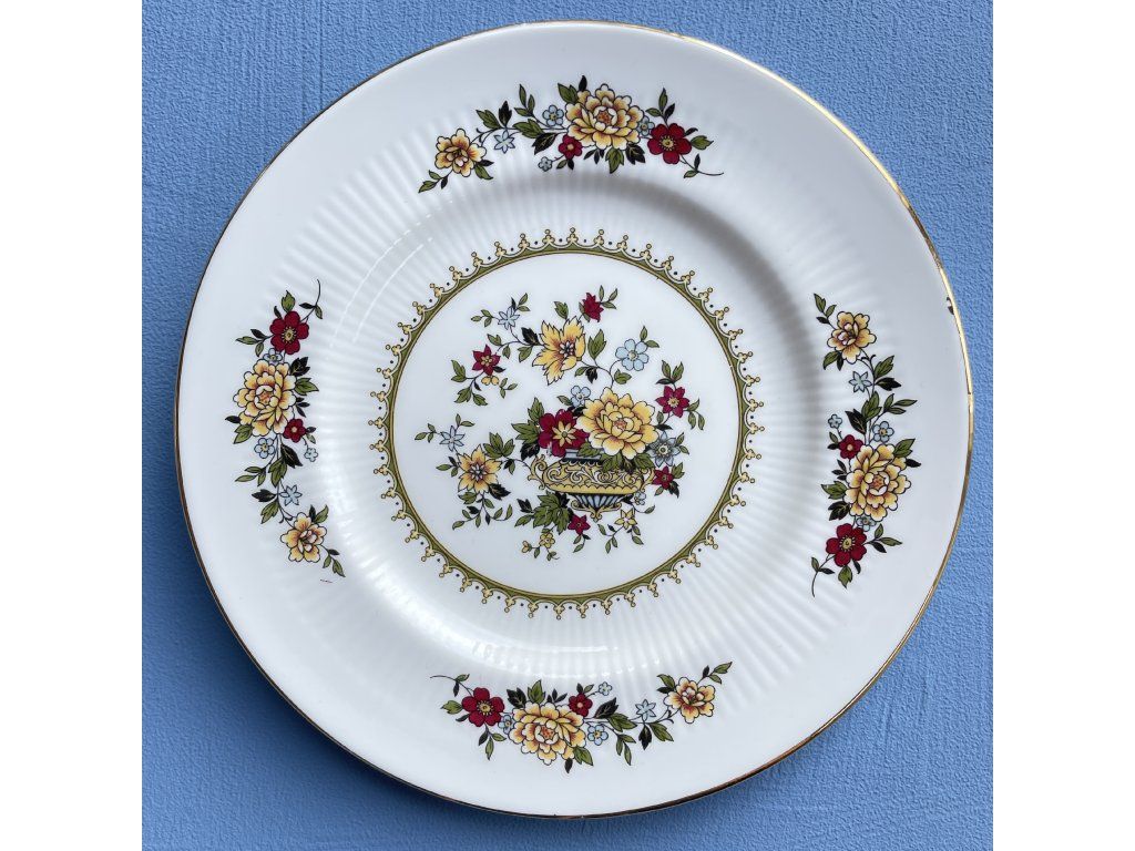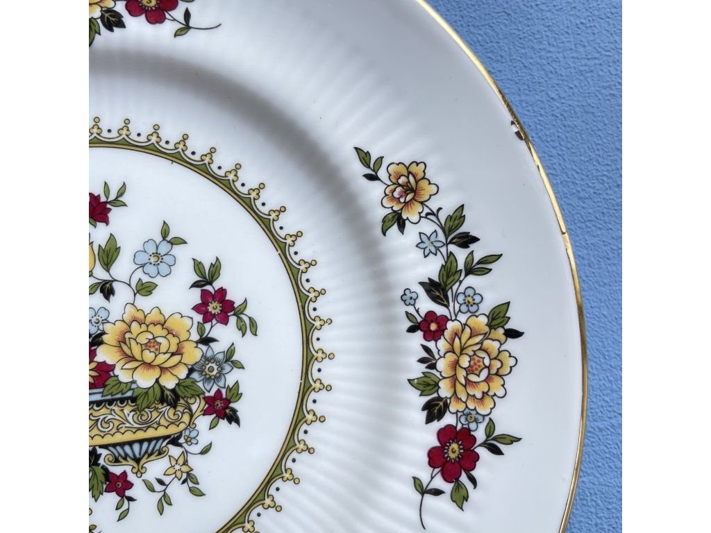 Ve středu talířku se nachází bohatý květinový motiv v podobě stylizované kytice v dekorativní nádobě, doplněný jemným zlatým ornamentálním věnečkem.