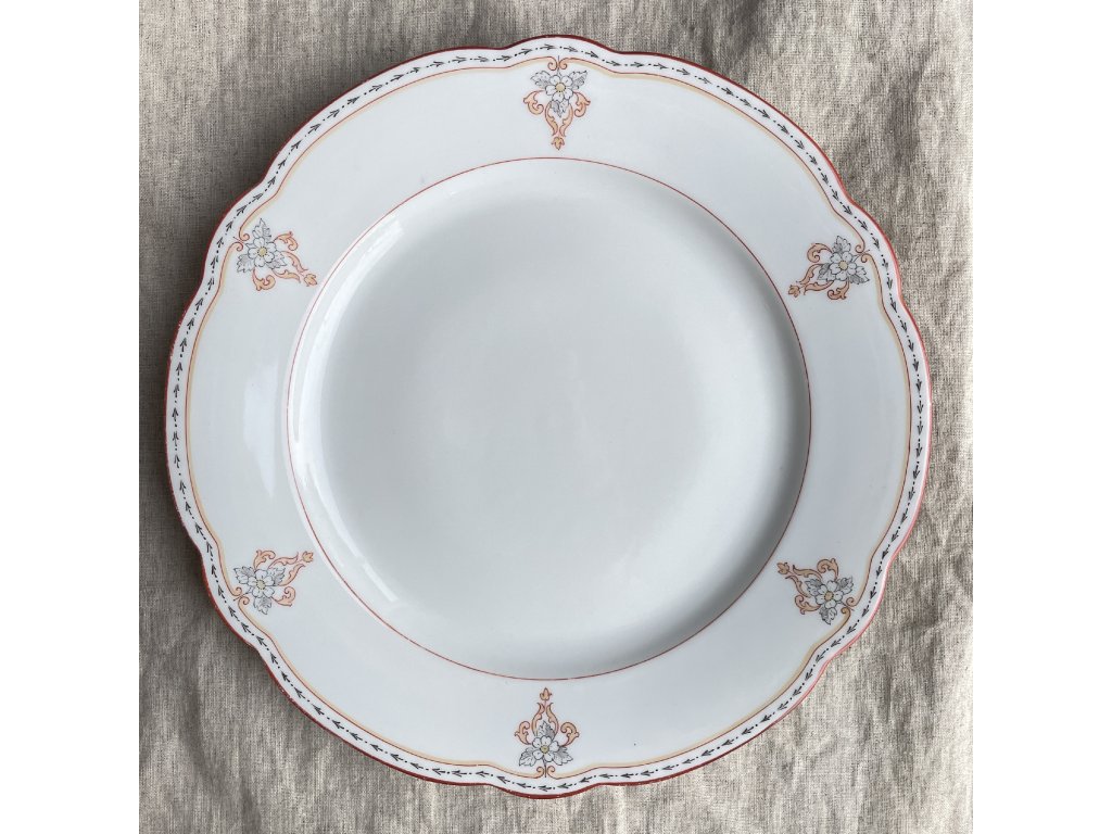 Po obvodu talíře se pravidelně opakují drobné květinové motivy v kombinaci jemné šedé, červené a teplého okrového tónu, doplněné stylizovanými rostlinnými ornamenty.