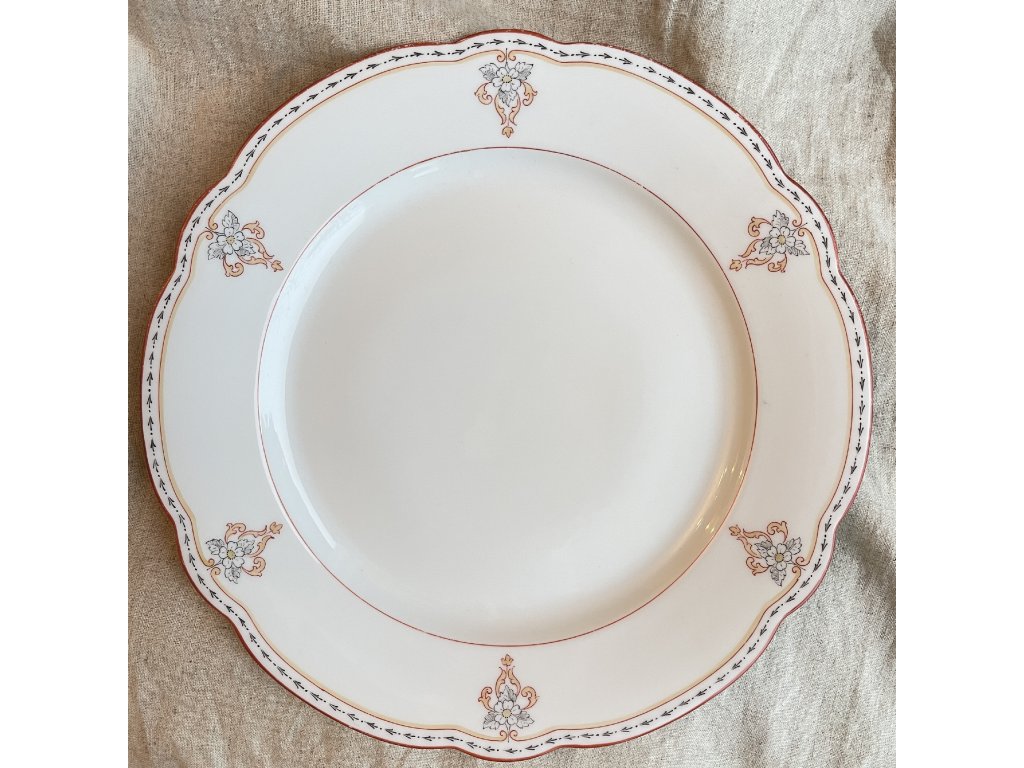 Po obvodu talíře se pravidelně opakují drobné květinové motivy v kombinaci jemné šedé, červené a teplého okrového tónu, doplněné stylizovanými rostlinnými ornamenty.