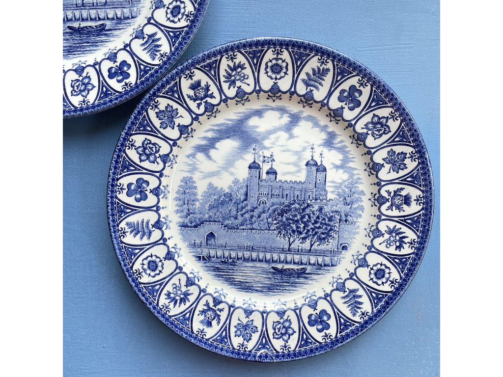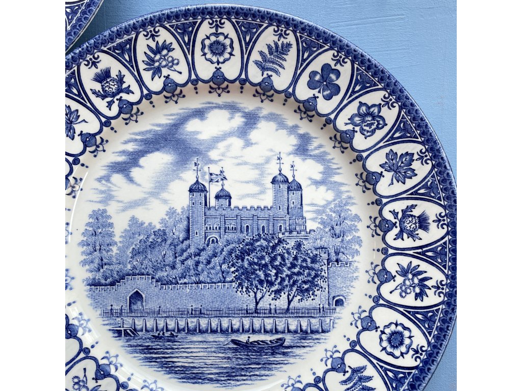 Výjev uprostřed talíře zobrazuje známou historickou památku Tower of London (Londýnský Tower), ikonickou pevnost s bohatou historií v srdci Londýna.