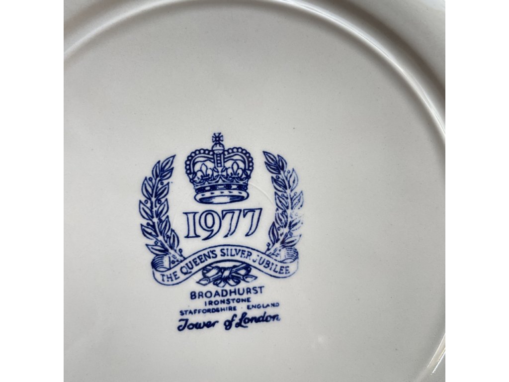 Mělký talíř je součástí sběratelské kolekce vydané v roce 1977 při příležitosti stříbrného jubilea královny Alžběty II.