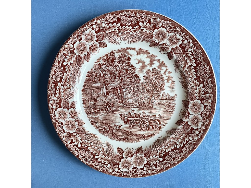 Mělký talíř je zdoben bohatým hnědočerveným transferovým tiskem s výraznou venkovskou scénou, která zachycuje idylický pohled na krajinu s usedlostí, stromy a figurální scénou s povozy a hospodářskými zvířaty.