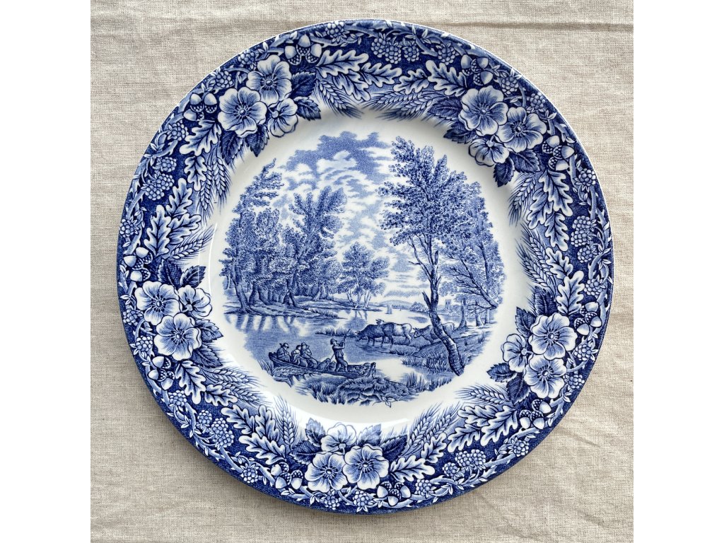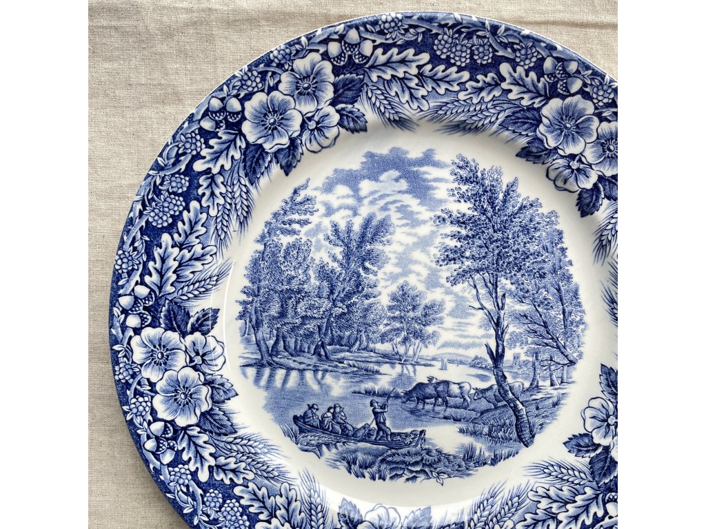 Mělký kameninový talíř je proveden v klasickém modrobílém transferovém dekoru s bohatě zdobeným okrajem, který rámuje klidnou krajinářskou scénu ve středu.
