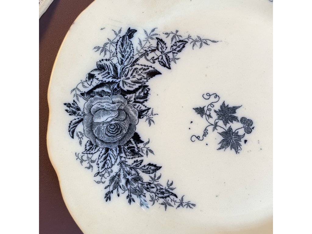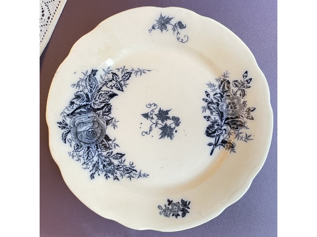 Talíř je vyroben z krémově bílého fajánsu s jemně zvlněným okrajem a nese bohatý tmavě modrý transferový dekor s květinovými motivy.