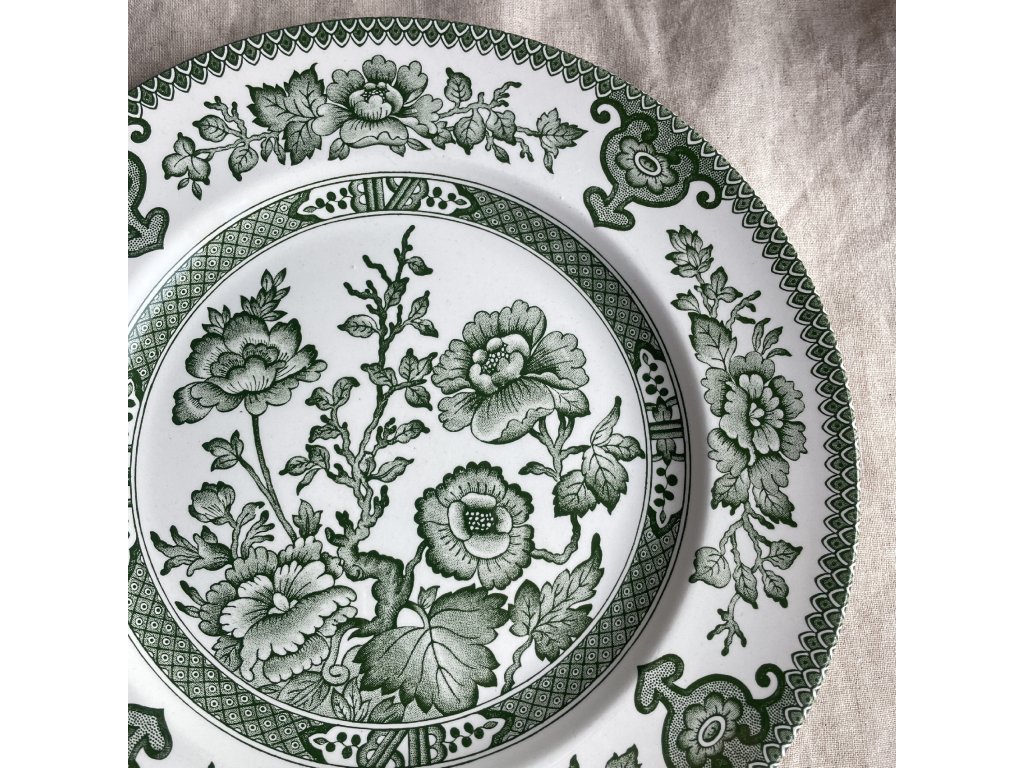 Celý dekor je proveden v tmavě zelené barvě na bílém podkladu, což dodává talíři elegantní a lehce historizující vzhled.