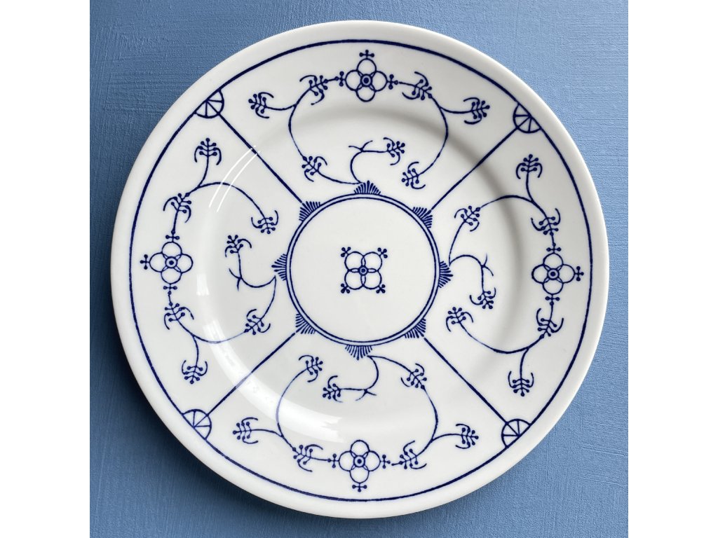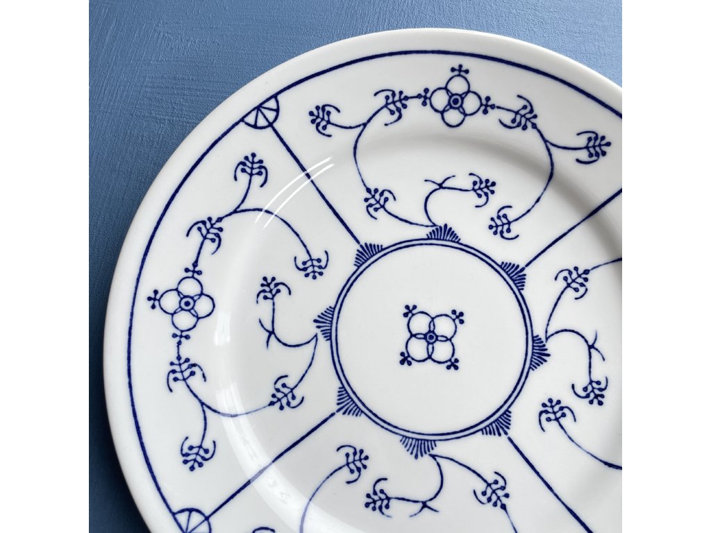 Mělký porcelánový talíř nese charakteristický modrobílý dekor „Blau Saks“ neboli „saská modř“, který je inspirován tradičním míšeňským vzorem.