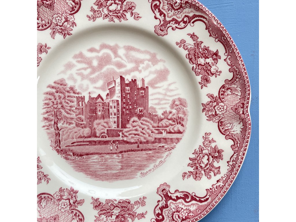 Středový motiv ukazuje monumentální stavbu obklopenou bohatou zelení, jezírkem a klidnou krajinou, typicky idealizovanou tak, jak ji keramické továrny ve Staffordshiru zobrazovaly již od 19. století.