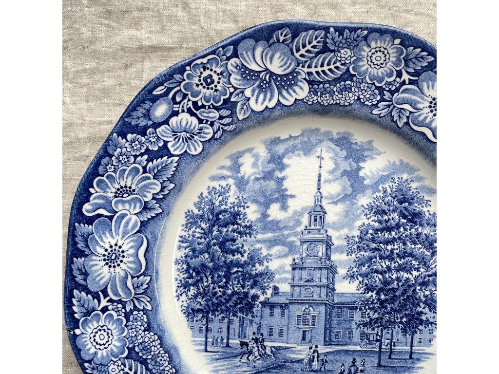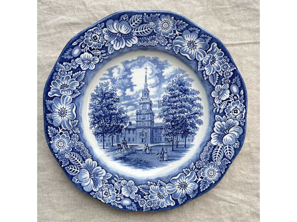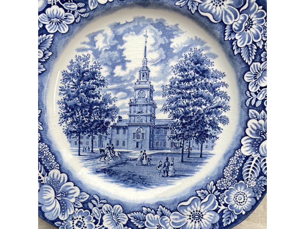 Mělký talíř je vyroben z kvalitního anglického ironstonu a zdoben klasickým modrobílým tiskem s bohatým květinovým lemem a centrálním motivem historické budovy Independence Hall, zpracovaným podle původních mědirytin.