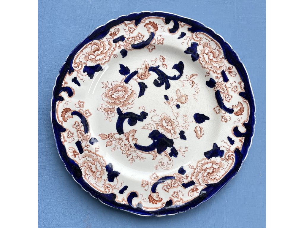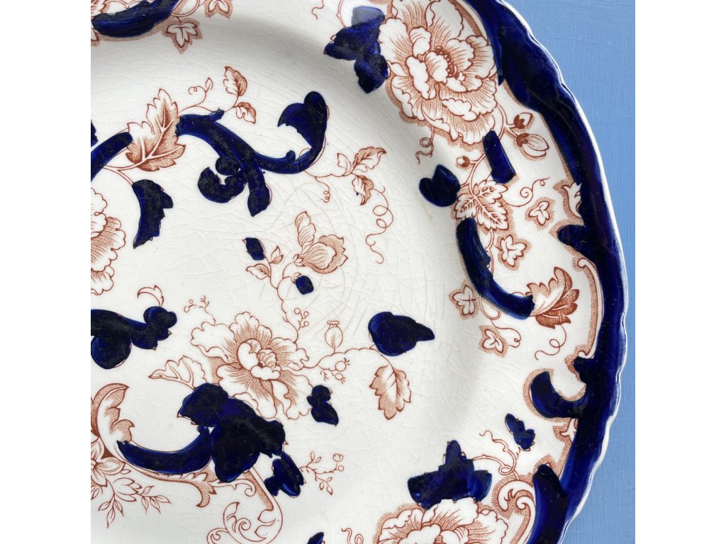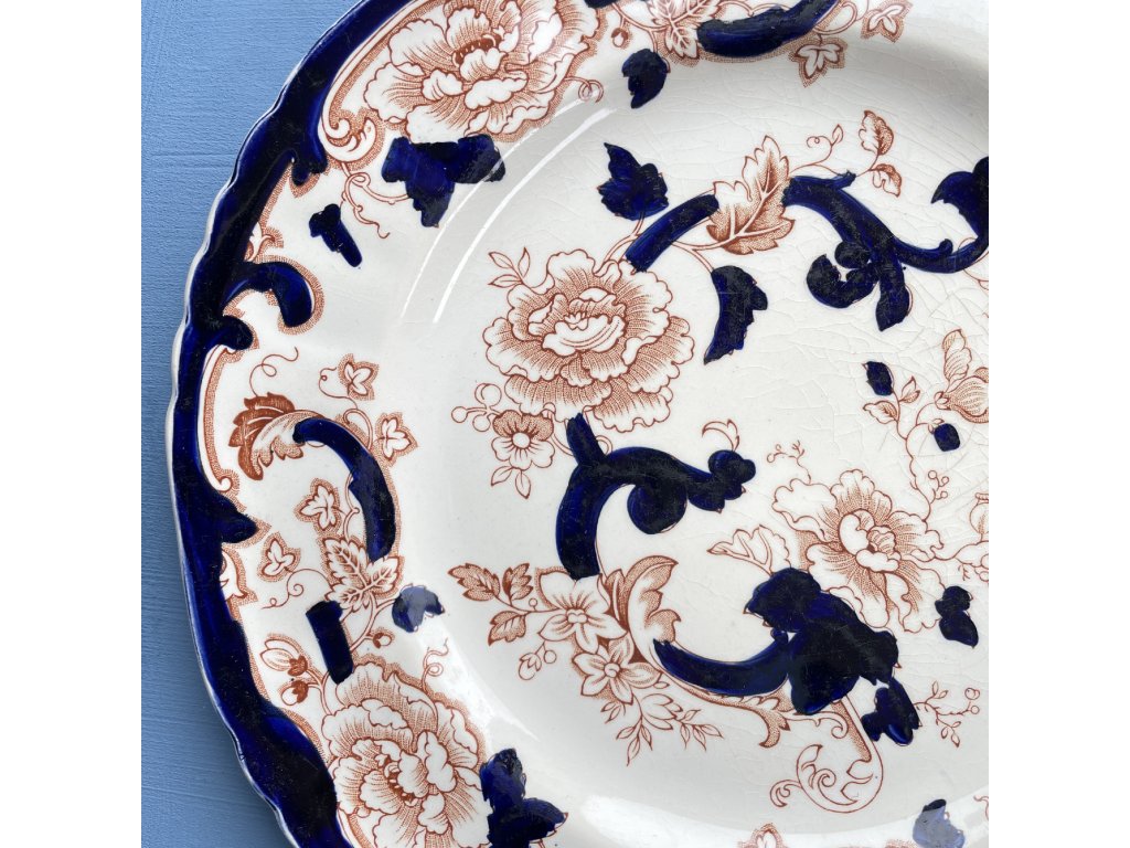 Dezertní porcelánový talíř s jemně zvlněným okrajem, zdobený bohatým květinovým dekorem v kombinaci kobaltově modré a teplé hnědočervené barvy.