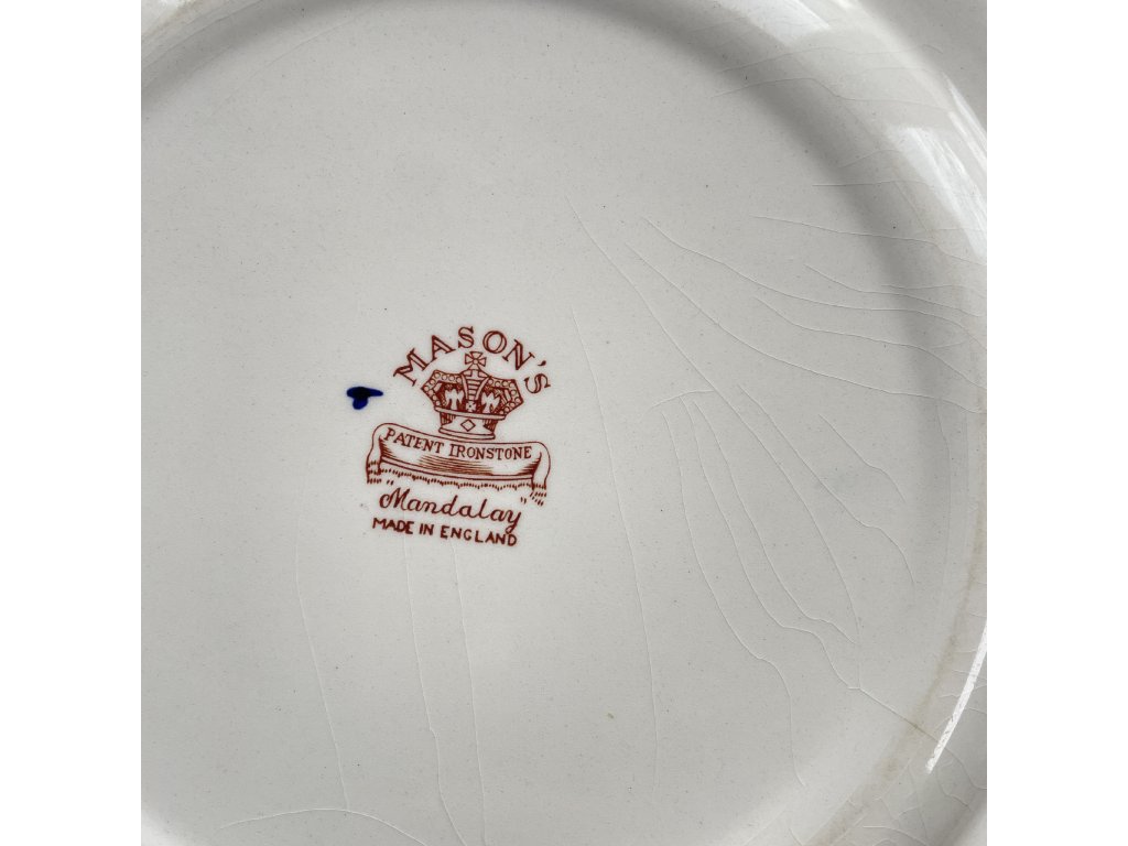 Značka Mason’s dekor Mandalay, značka potvrzuje výrobu u firmy Mason’s a řadí talíř do období přelomu 19. a 20. století, kdy byla ironstone keramika ceněna pro svou pevnost i dekorativní kvalitu.