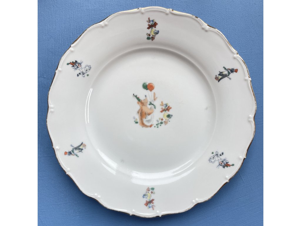 Na okraji talíře jsou jemně rozmístěny další malé postavičky a zvířátka v podobném stylu, čímž dekor získává příjemně vyprávěcí charakter.