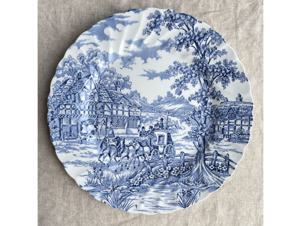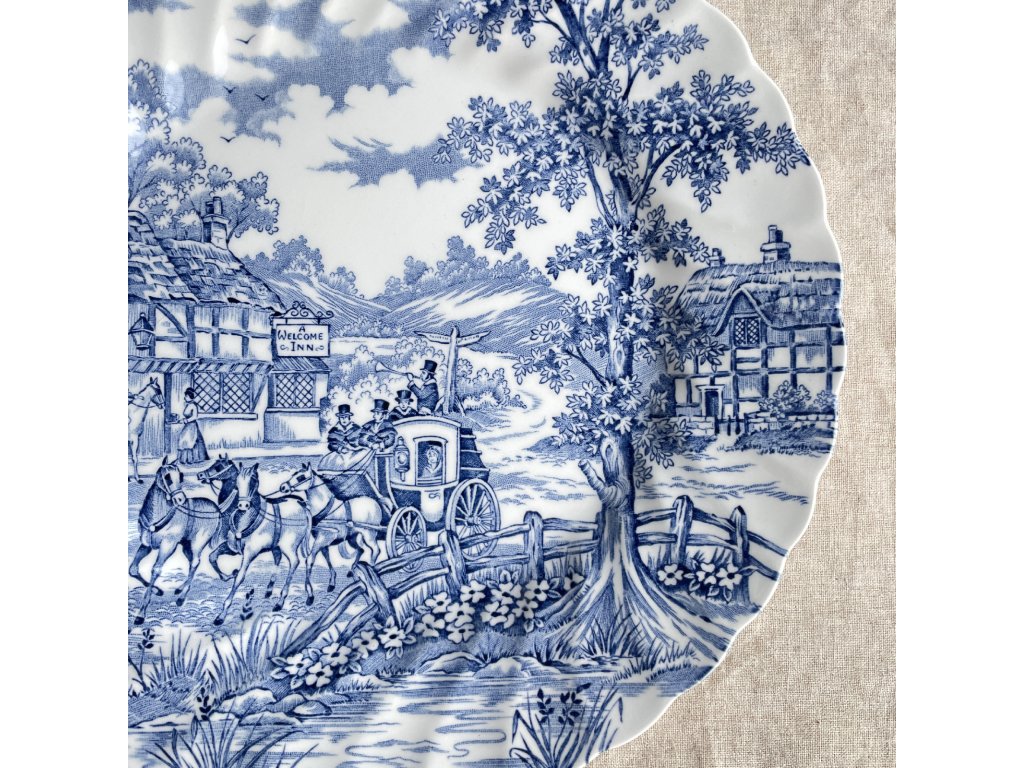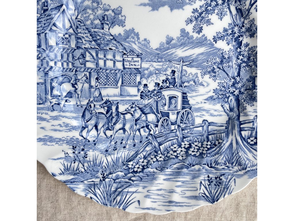 Mělký talíř je zdoben klasickým modrobílým transferovým dekorem Coaching Days, který zachycuje romantickou scénu z anglického venkova s dostavníkem taženým koňmi přijíždějícím k hostinci s vývěsním štítem „Welcome Inn“.
