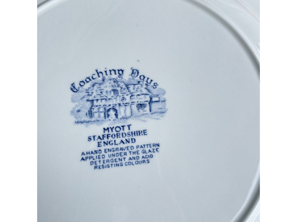 Značení odpovídá produkci továrny Myott ze Staffordshiru a potvrzuje, že dekor je aplikován pod glazurou, což zajišťuje jeho dobrou odolnost při běžném používání.