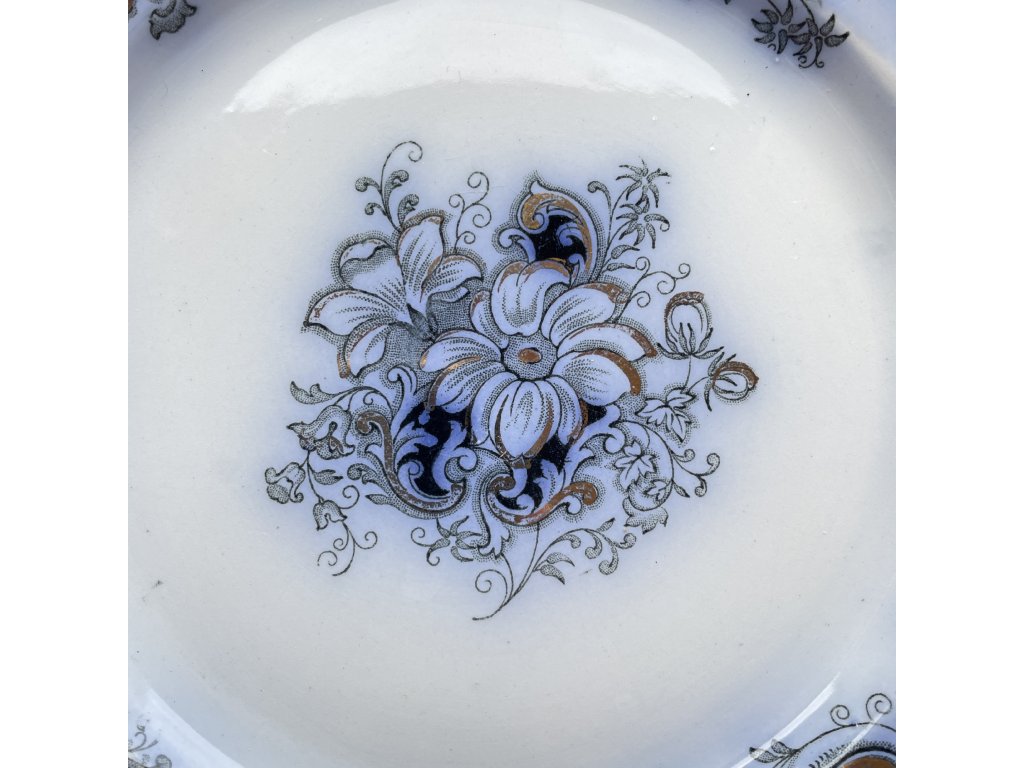 Zlaté akcenty jemně zvýrazňují křivky ornamentu a dodávají talíři slavnostní, luxusní charakter.