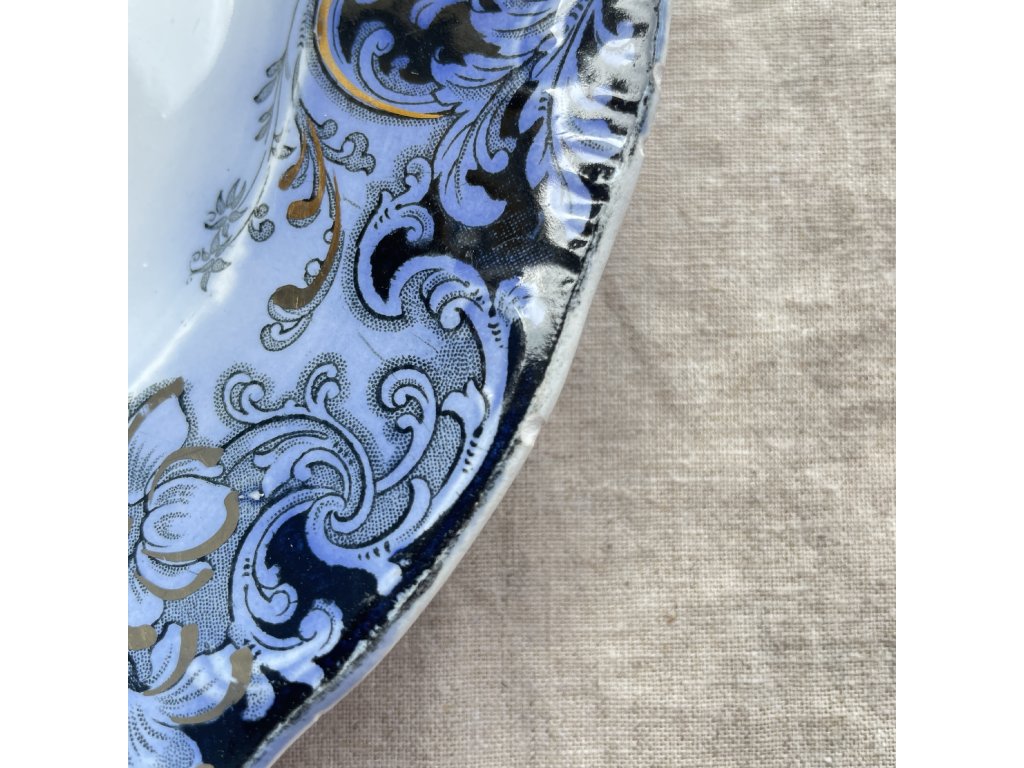 Okraj je výrazně zvlněný a po celém obvodu nese hustý ornamentální dekor v kombinaci tmavě modré, světlejší modrošedé a zlaté barvy.