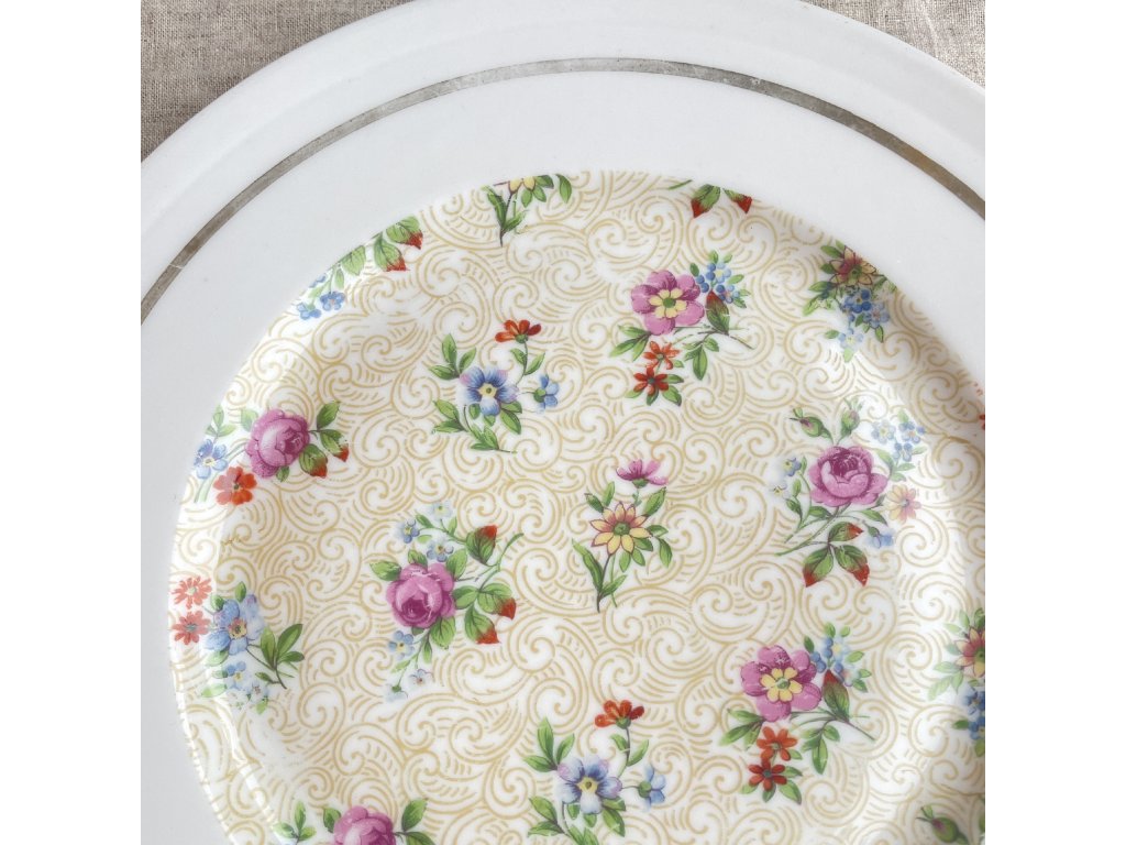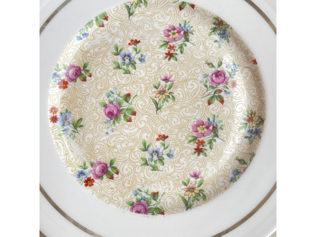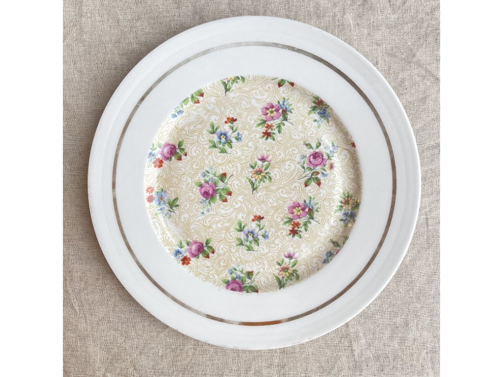 Okraj talíře je ponechán čistě bílý a zvýrazněn zlatou linkou.