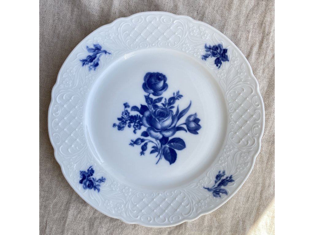 Střed talíře zdobí výrazná kobaltově modrá květinová kompozice s motivem stylizovaných růží doplněných listy a drobnými kvítky.