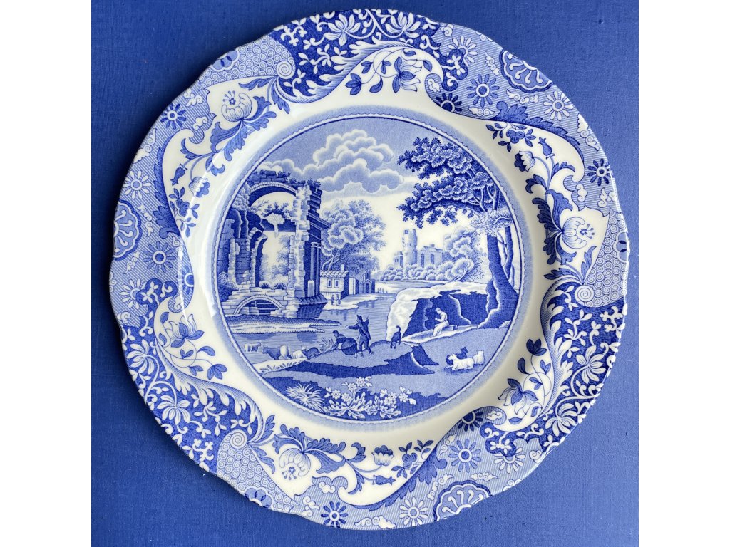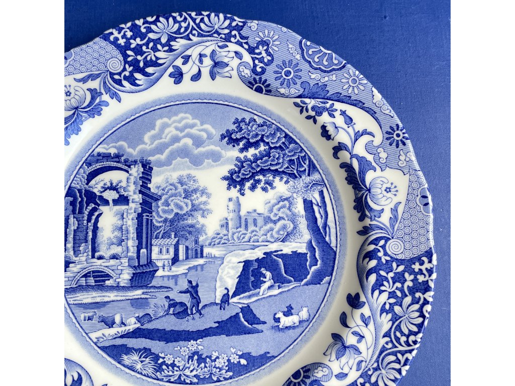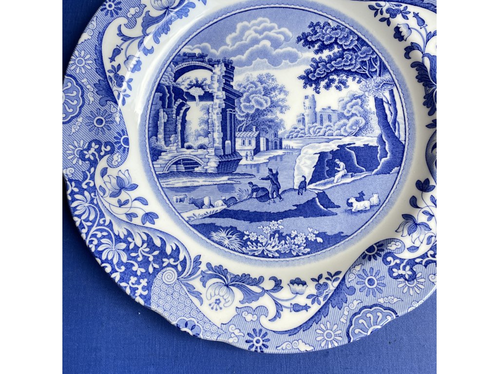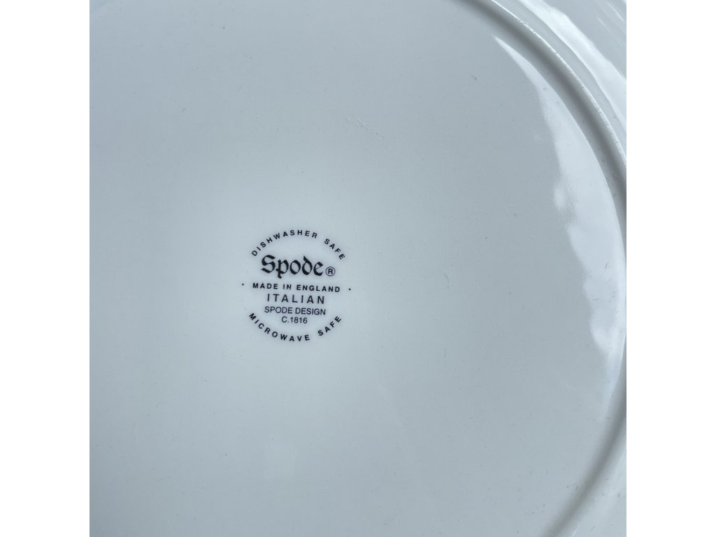 Mělký porcelánový talíř pochází z výroby anglické značky Spode a nese ikonický dekor Italian, který byl navržen již kolem roku 1816.