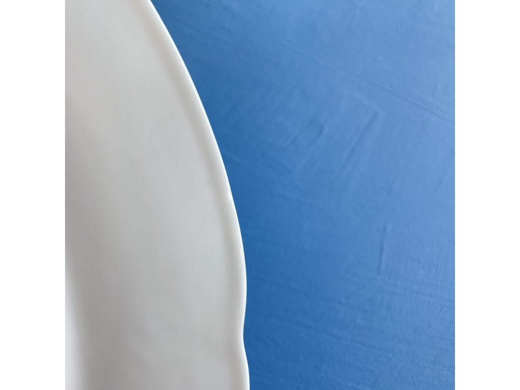 Talíř má klasický kruhový tvar s jemně zvlněným, plasticky modelovaným okrajem, který dodává celku elegantní a kultivovaný výraz.