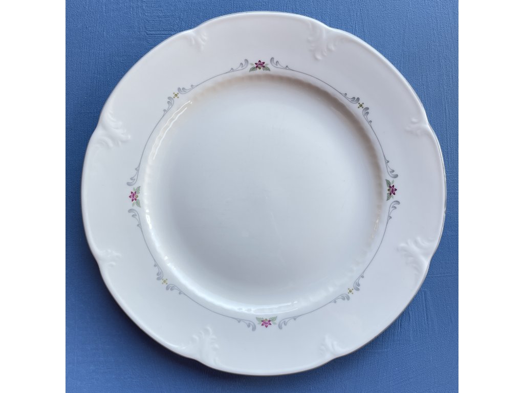 Dekor je velmi střídmý a nadčasový – tenká šedá linka obíhá po obvodu talíře a je doplněna drobnými ornamenty a jemnými květinovými motivy v růžové barvě se zelenými lístky a nenápadnými zlatavými tečkami.