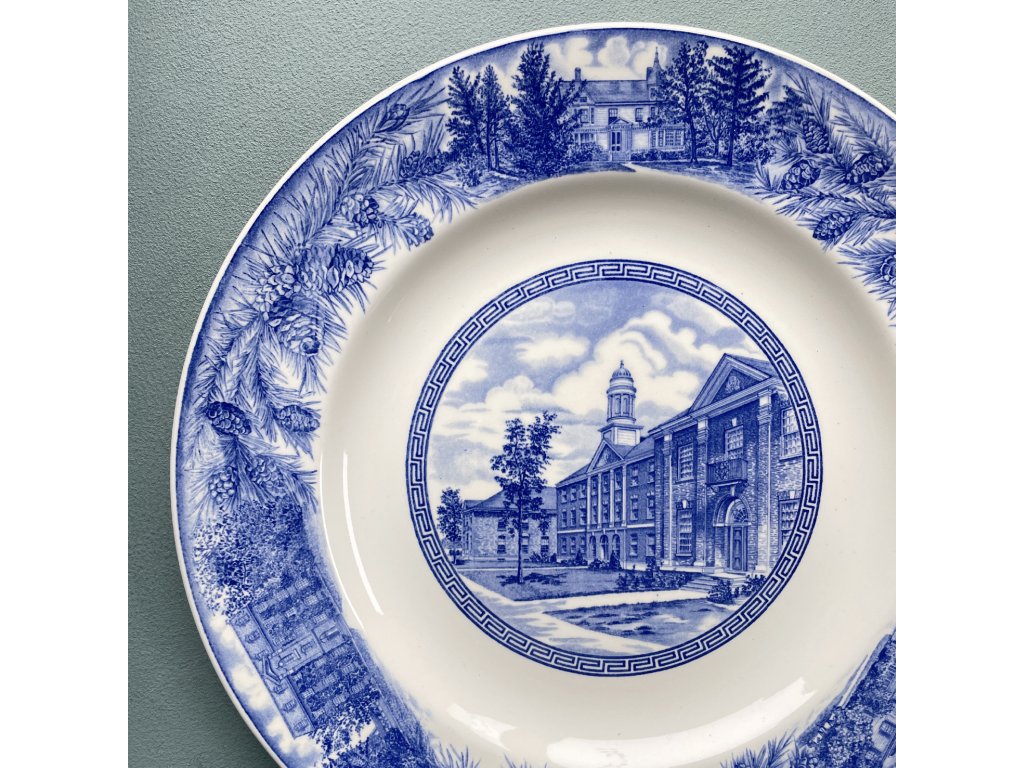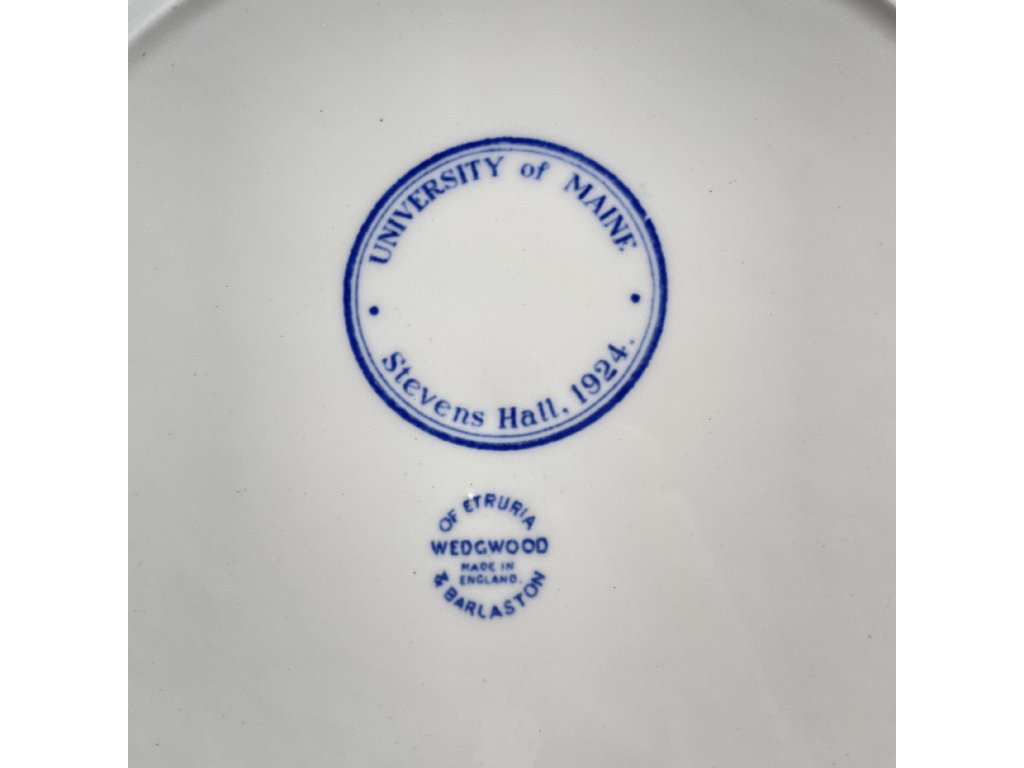 Porcelánový talíř je sběratelský kus zdobený jemným modrobílým transferovým tiskem, který zobrazuje budovu Stevens Hall z roku 1924, nacházející se na University of Maine v USA.