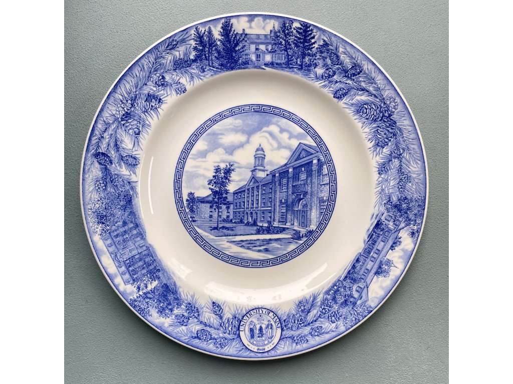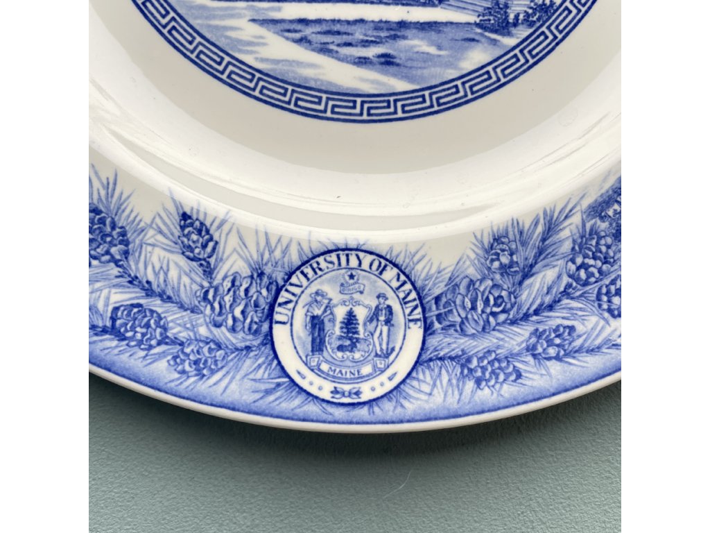 Centrální motiv je orámován řeckým klíčem a na okraji talíře jsou zobrazeny různé univerzitní budovy, symboly a přírodní motivy — zejména větvičky borovic se šiškami, což odkazuje na stát Maine, známý jako "Pine Tree State".