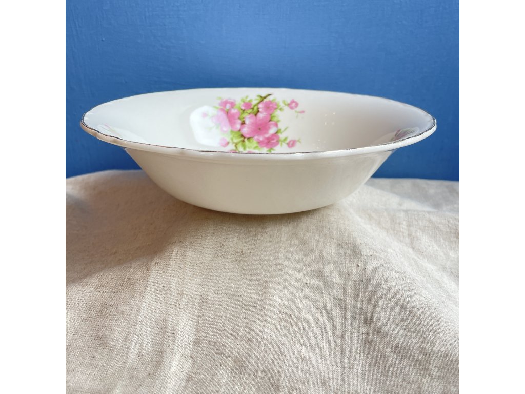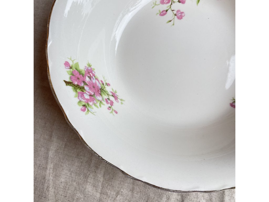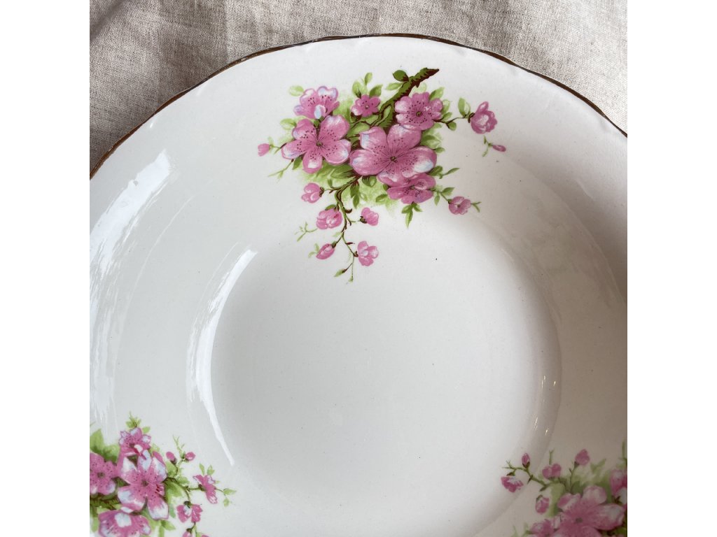 Dekor tvoří tři shodné motivy větviček s drobnými růžovými kvítky, pravděpodobně květy třešně nebo jabloně, doplněné svěže zelenými lístky.