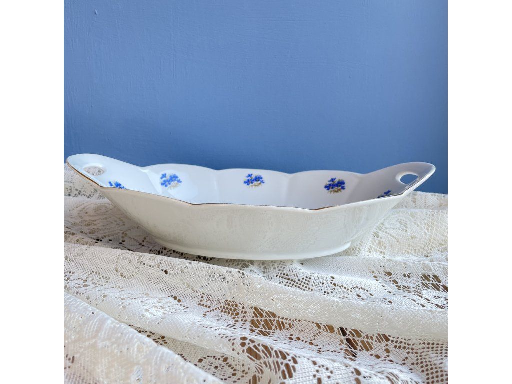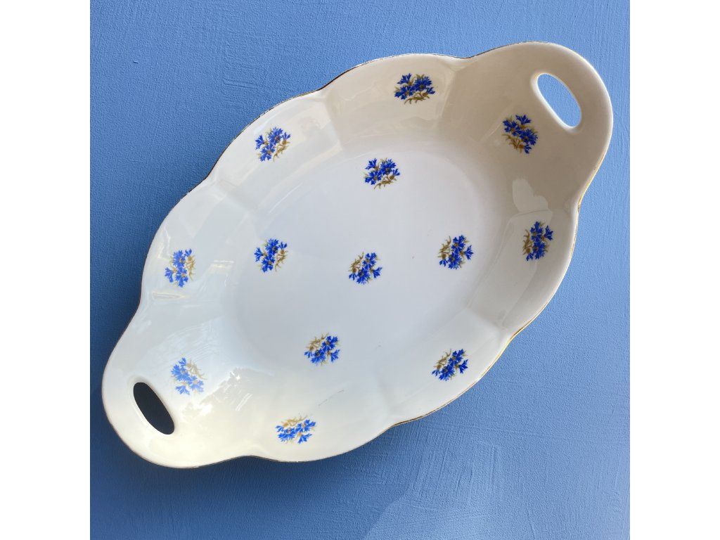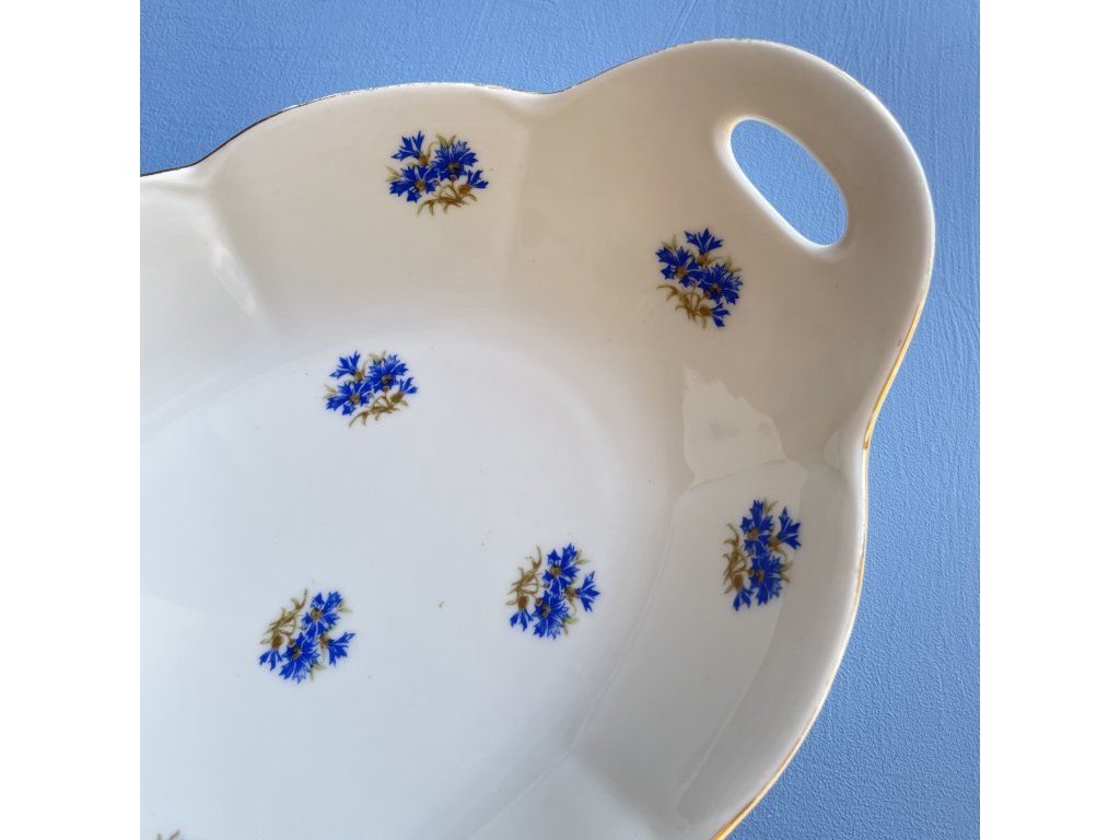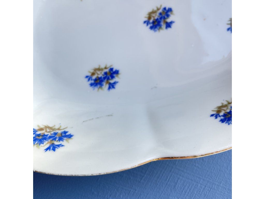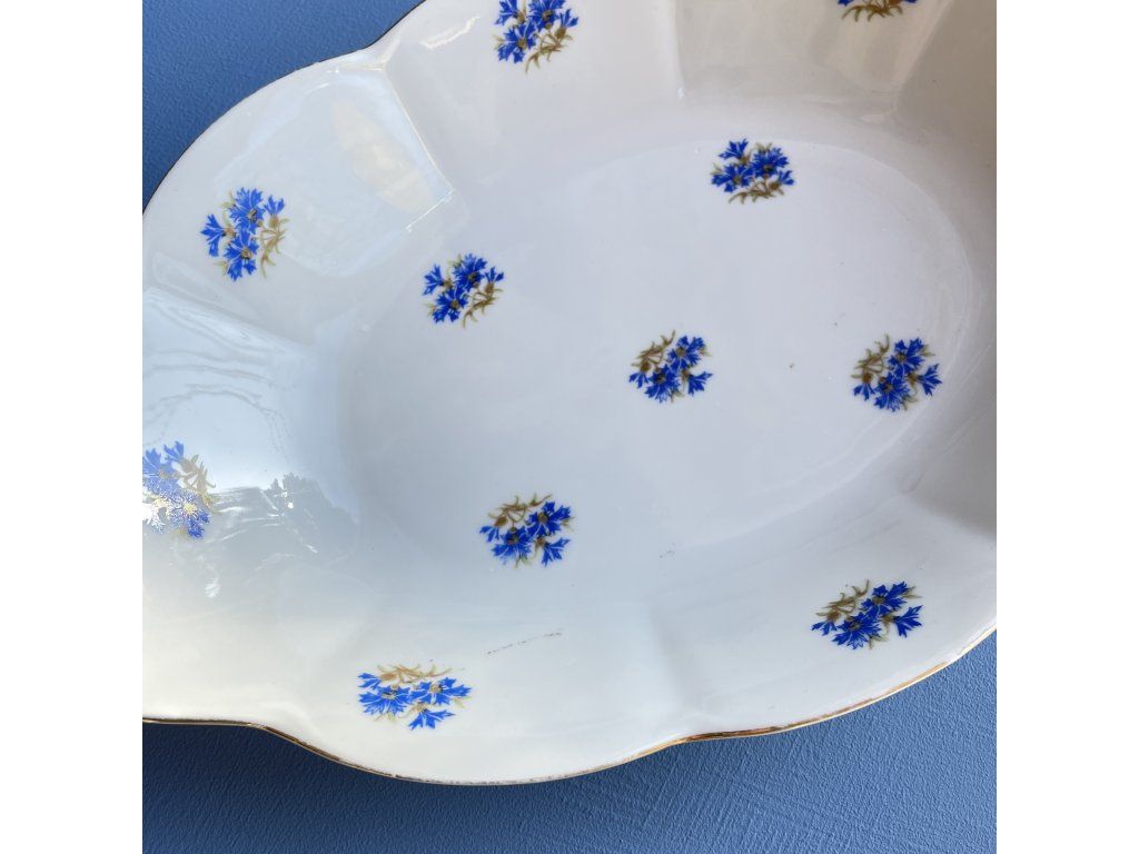 Dekor tvoří drobné květinové motivy stylizované chrpy – v modré barvě s jemnými zlatavými detaily.
