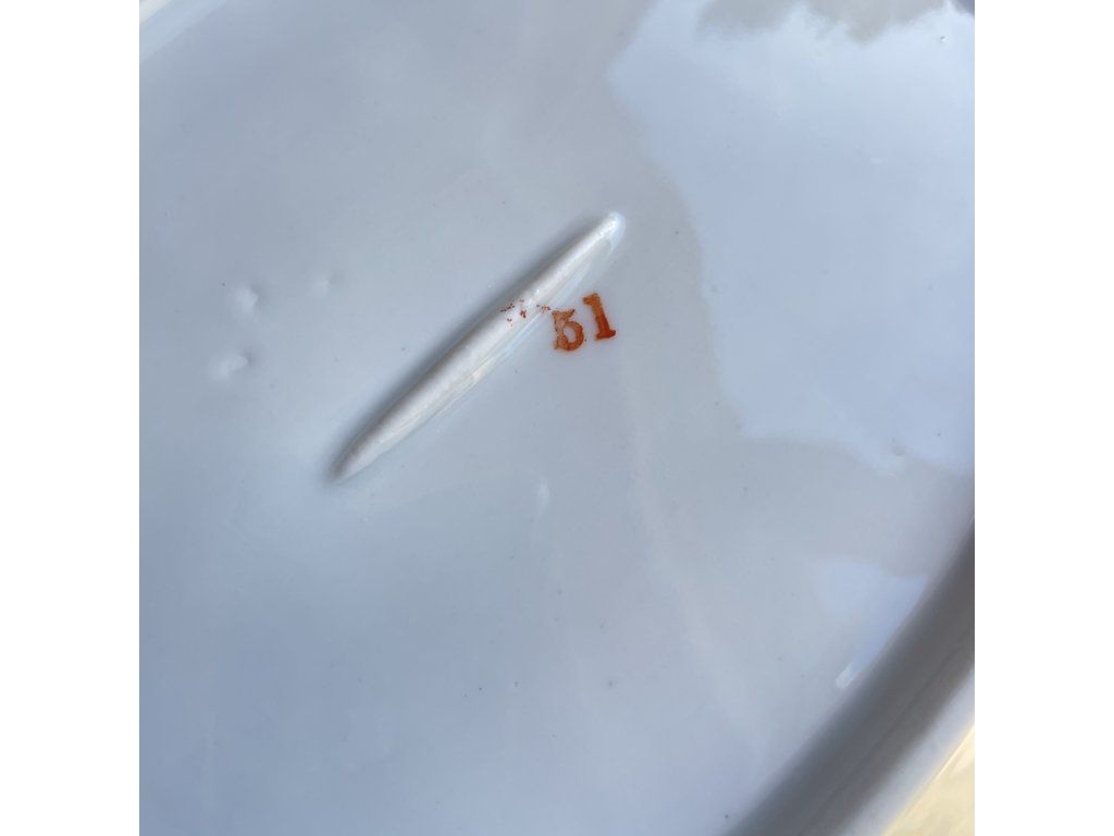 Bílý porcelán má lesklou glazuru, která místy vykazuje lehké známky používání (jemné škrábnutí v ploše).