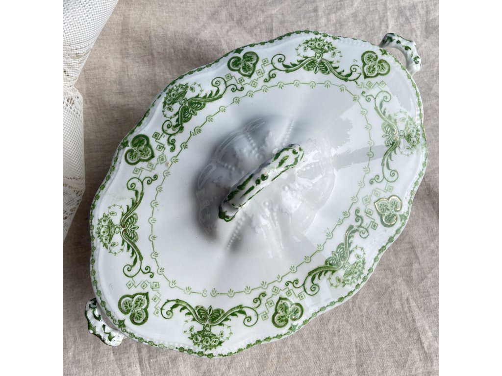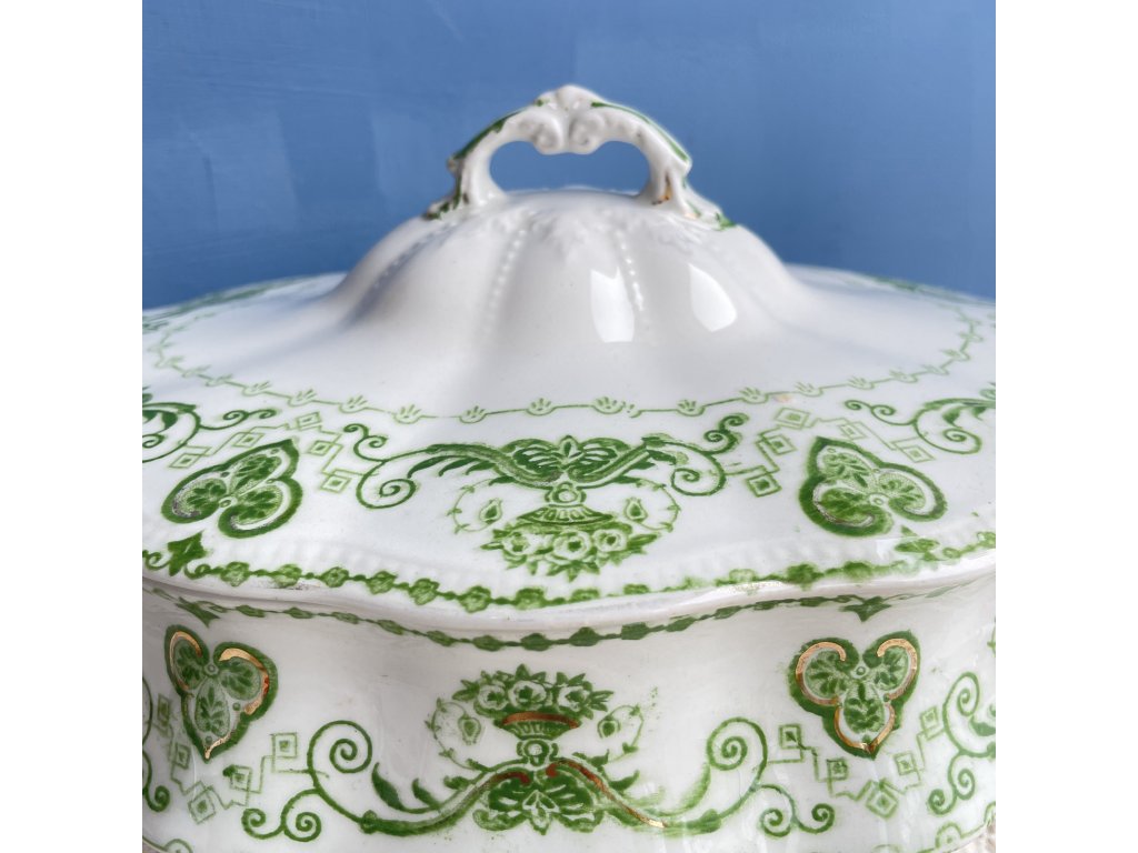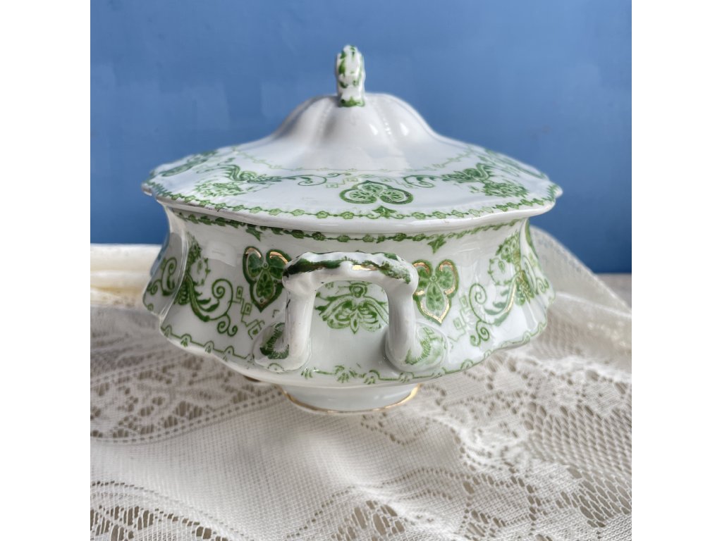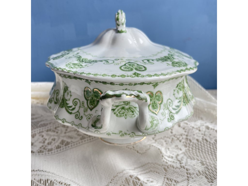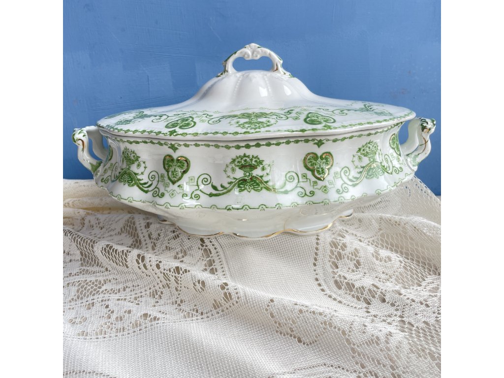Porcelánová mísa s víkem je elegantním příkladem dekorativního užitkového porcelánu inspirovaného historizujícími a secesními prvky.