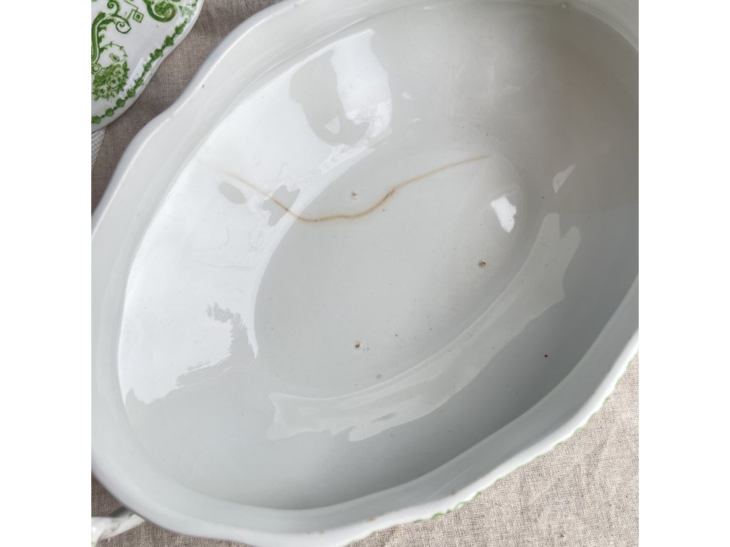 Po obvodu je mísa zdobena zeleným ornamentálním dekorem tvořeným stylizovanými květy, srdcovými motivy a jemnými linkami, místy zvýrazněnými zlatou konturou.