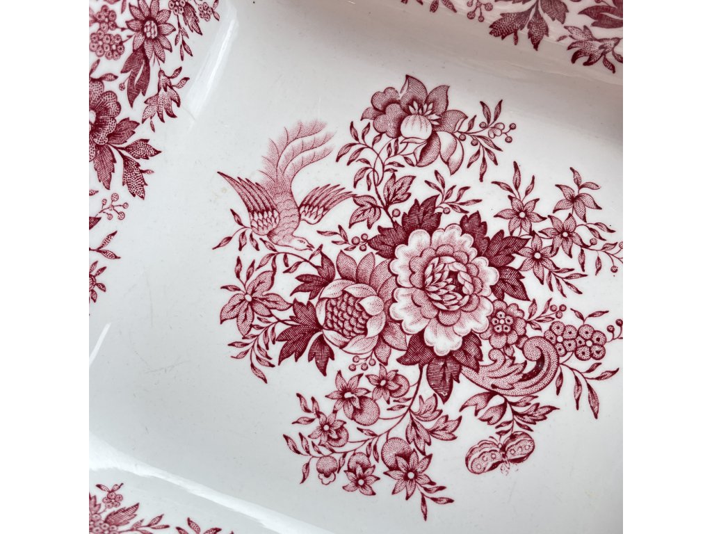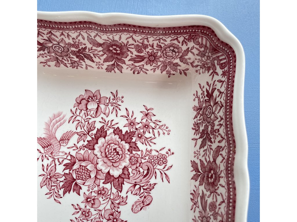 Zdobí ji výrazný červený transferový dekor s bohatým květinovým motivem a stylizovaným ptákem uprostřed, doplněný jemně vlnitým okrajem.