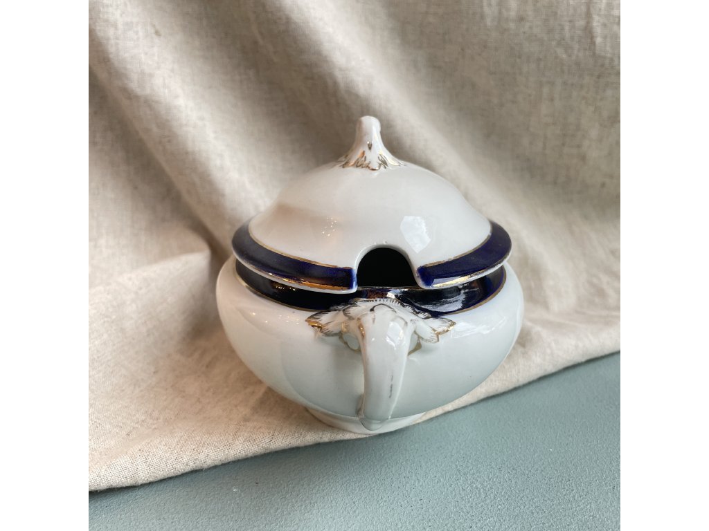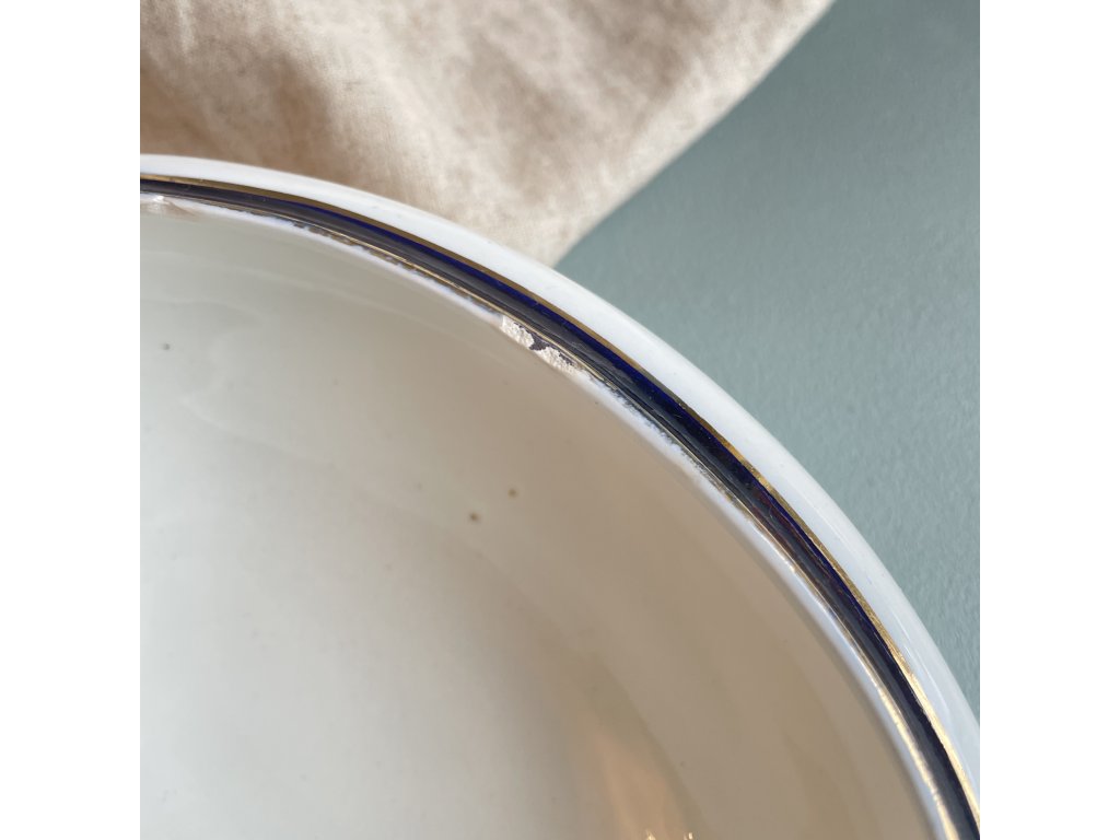 Zdobí ji hluboký kobaltově modrý pás lemovaný zlatou linkou, která zvýrazňuje tvar a dodává nádobě noblesní charakter.