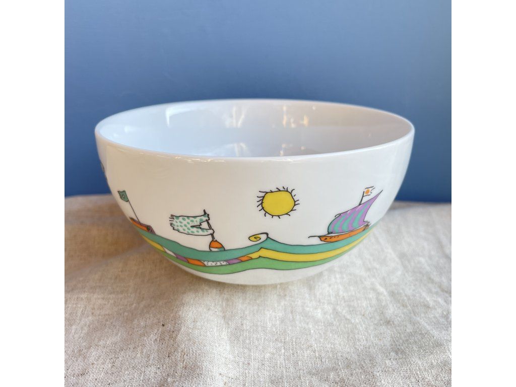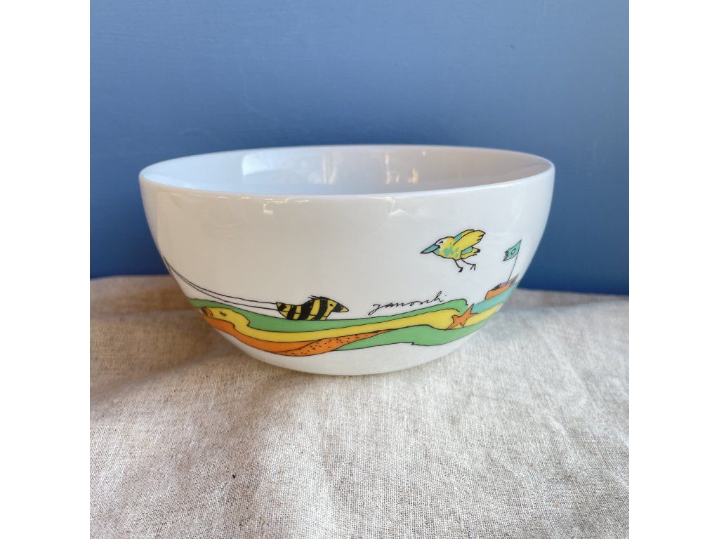 Vnější stěna misky je zdobena hravým, barevným dekorem inspirovaným ilustracemi Janosch.