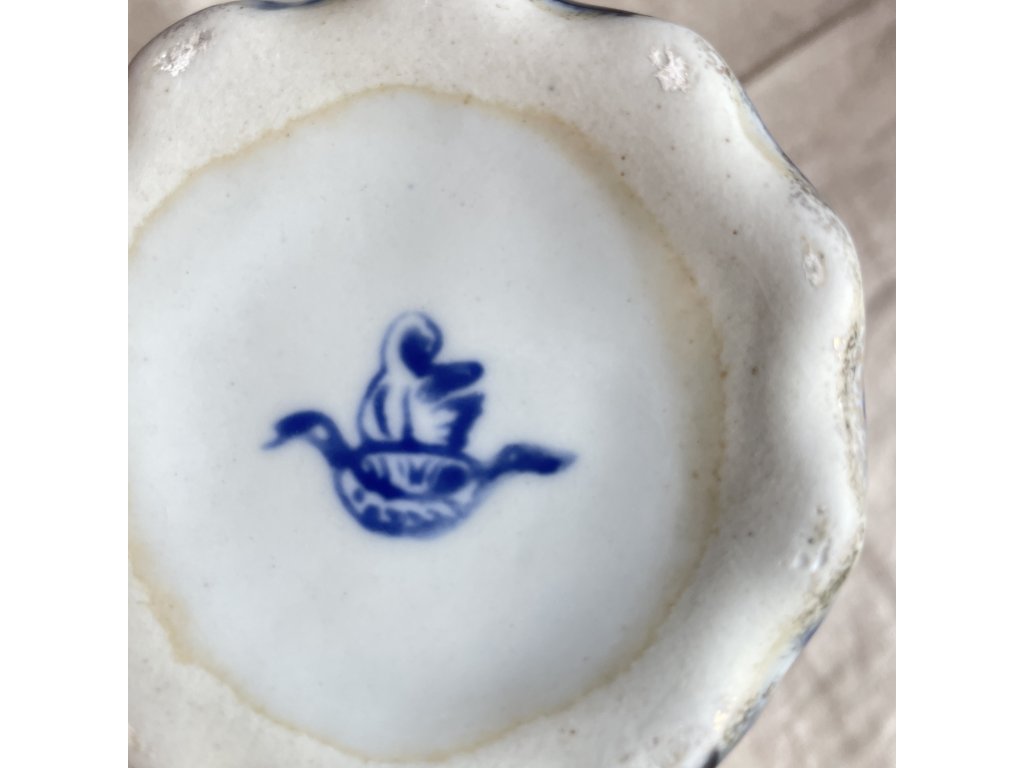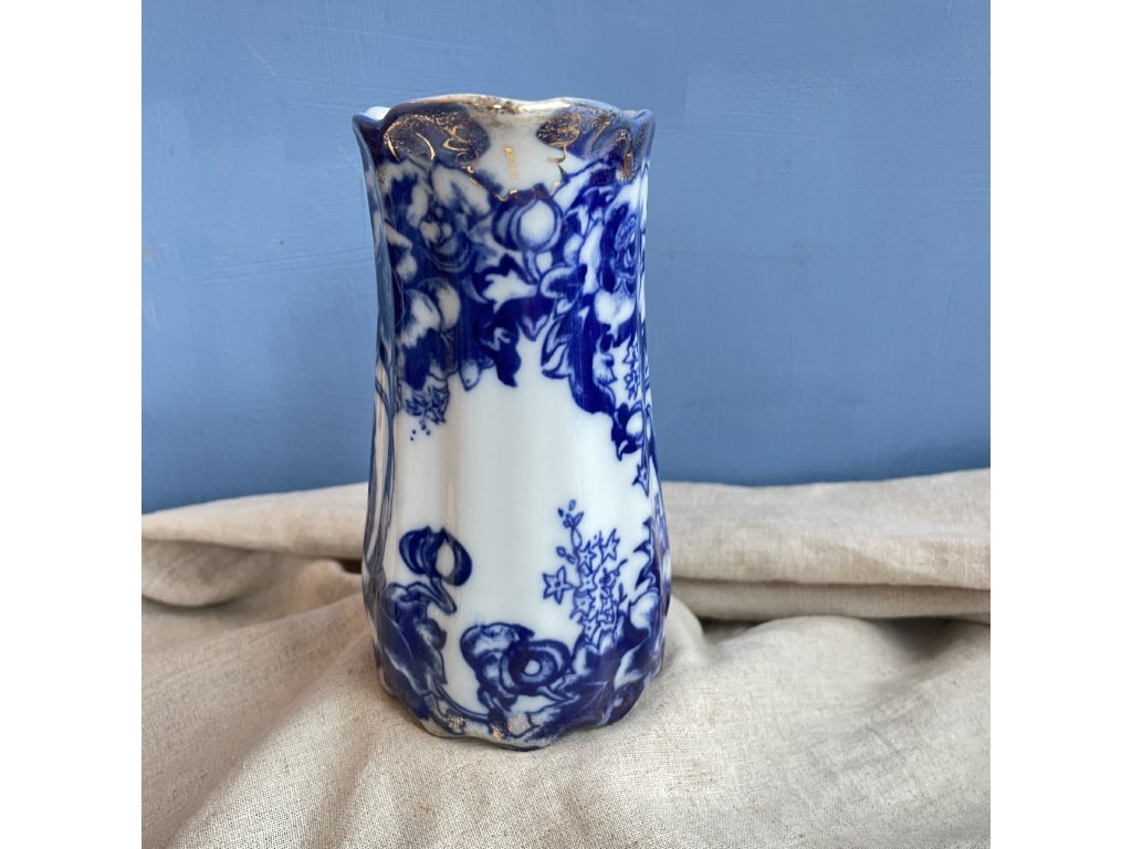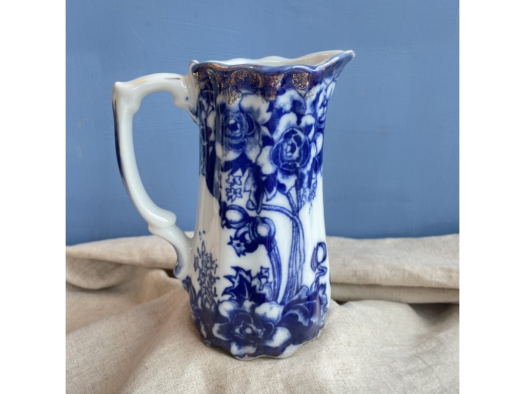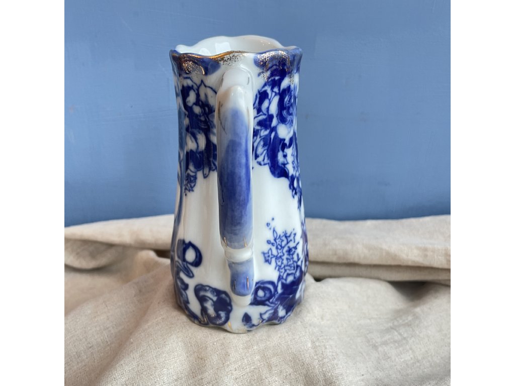 Džbánek samotný je dekorován výrazným kobaltově modrým květinovým vzorem, typickým pro tzv. "flow blue" porcelán, tedy porcelán s rozpitým modrým potiskem, který byl oblíbený především v období viktoriánské éry.