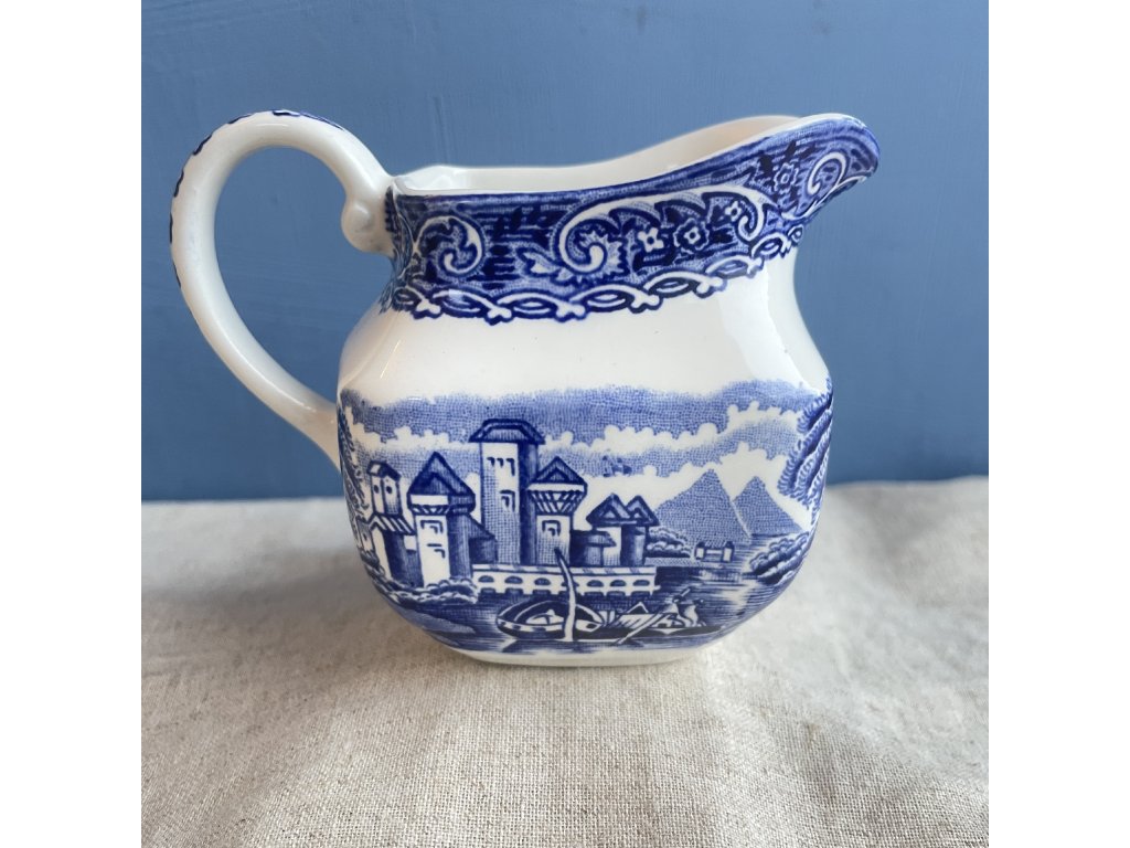 Porcelánová mlékovka je zdobena klasickým modrobílým krajinovým dekorem River Scene, který patří k nejtypičtějším a dlouhodobě oblíbeným motivům anglického přenosového tisku.