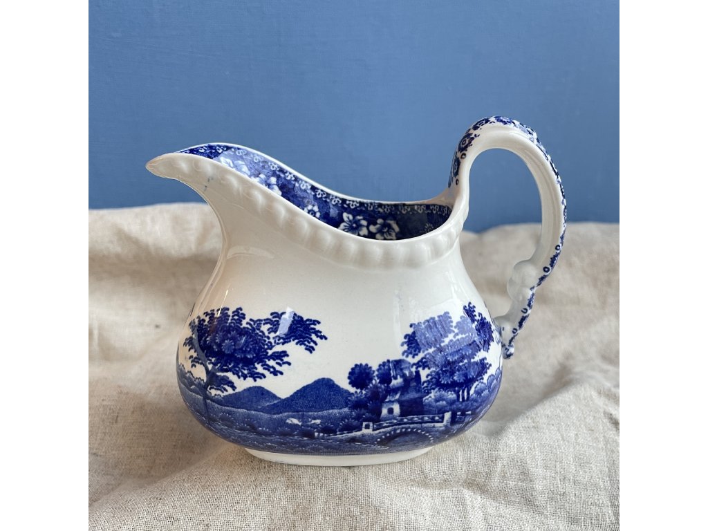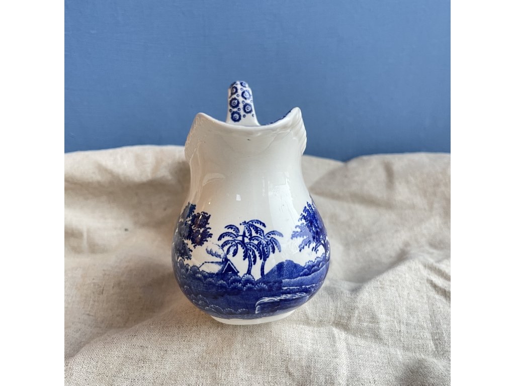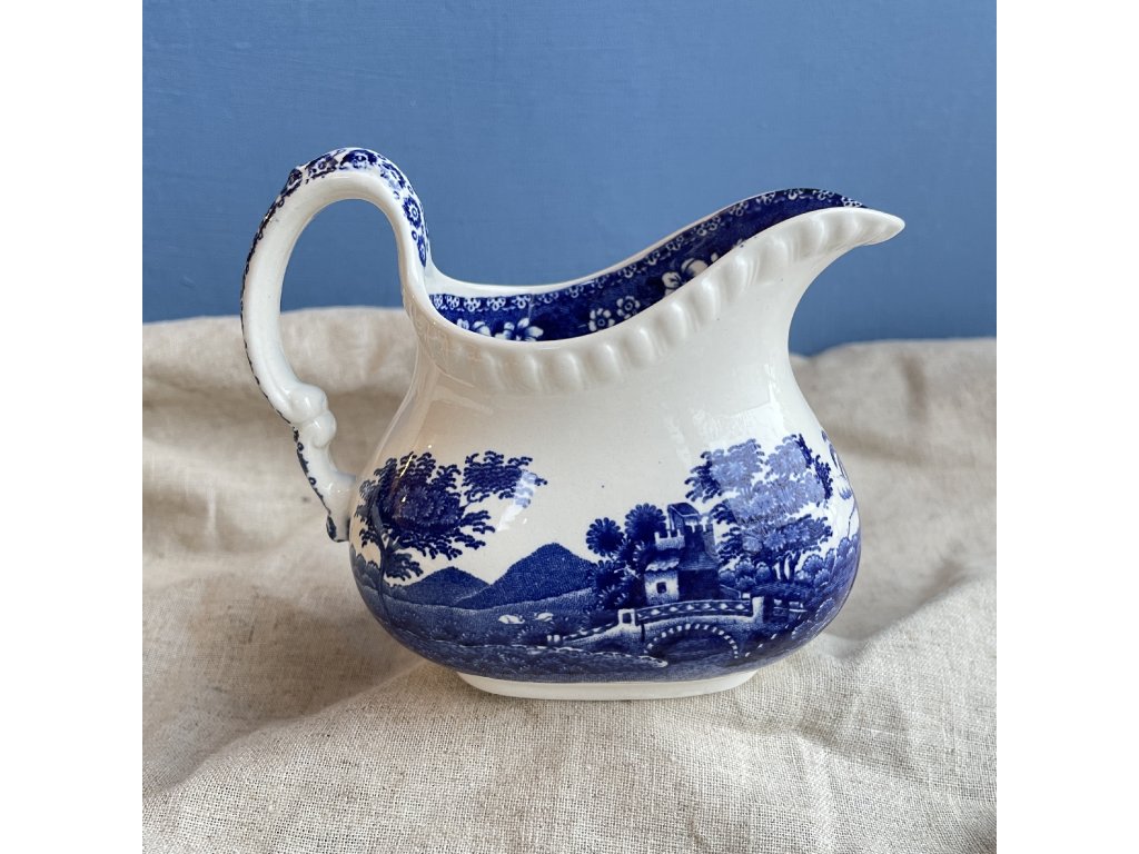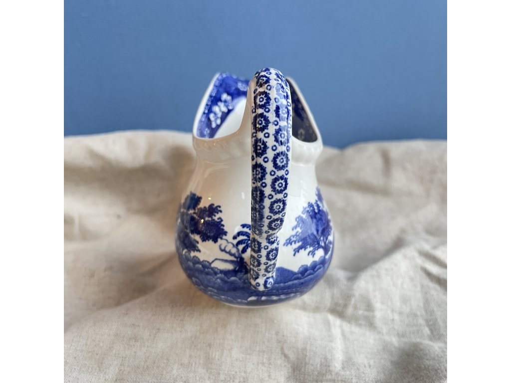 Mlékovka je elegantním kusem anglického porcelánu s klasickým modrobílým dekorem, typickým pro sérii „Spode’s Tower“ značky Copeland.