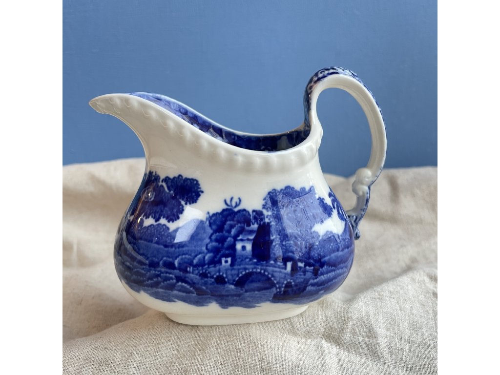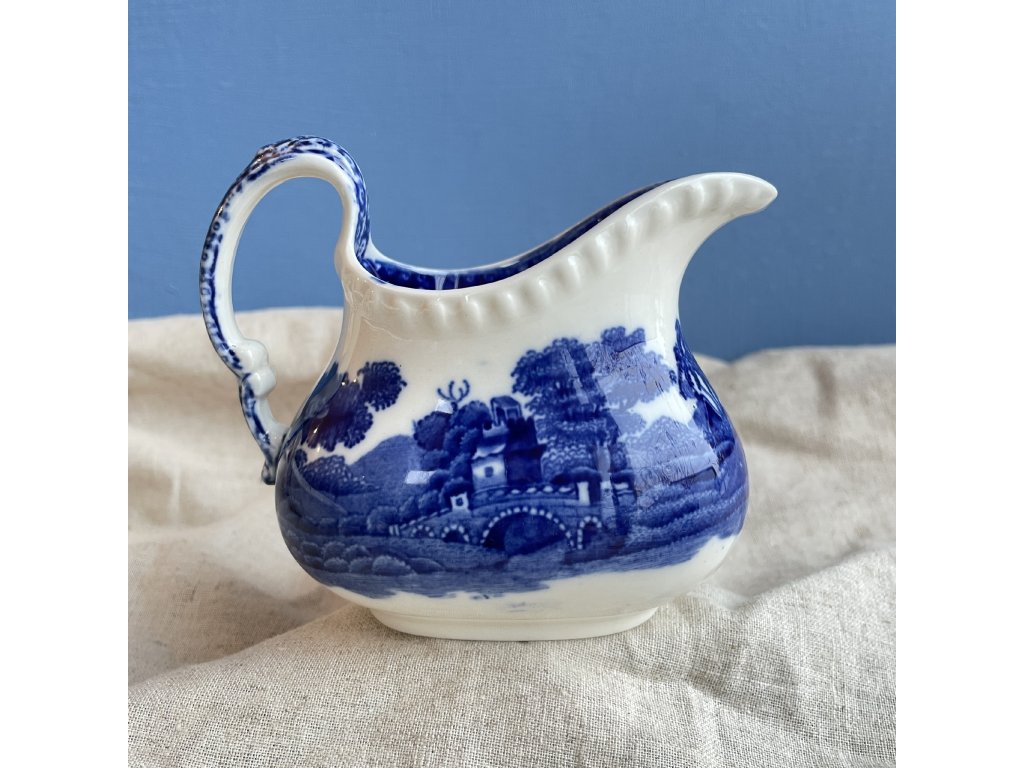 Mlékovka je elegantním kusem anglického porcelánu s klasickým modrobílým dekorem, typickým pro sérii „Spode’s Tower“ značky Copeland.