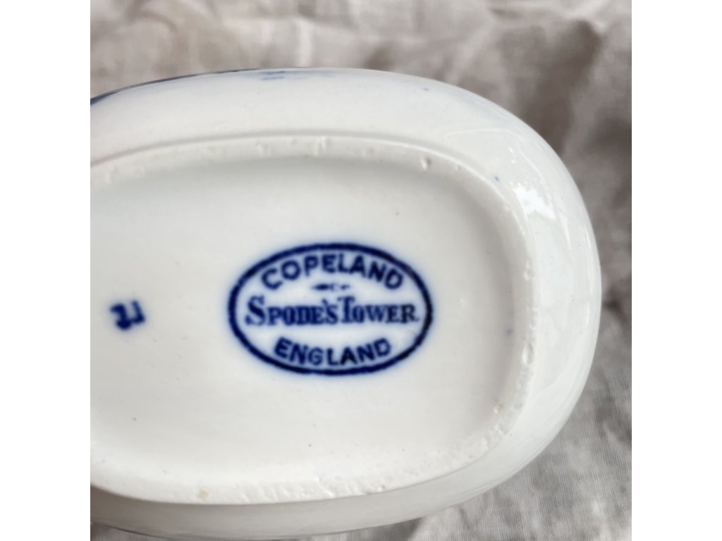 Na spodní straně je zřetelně vyznačena značka Copeland Spode’s Tower England v modrém oválu.