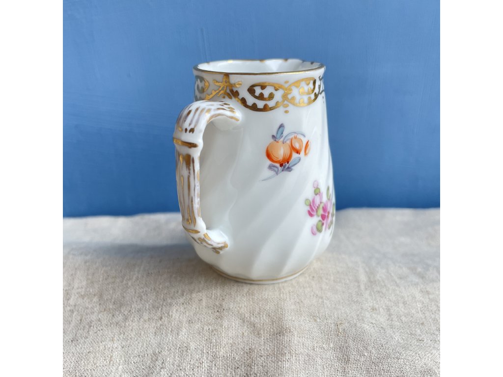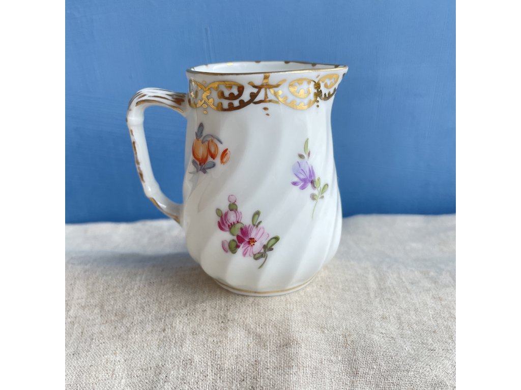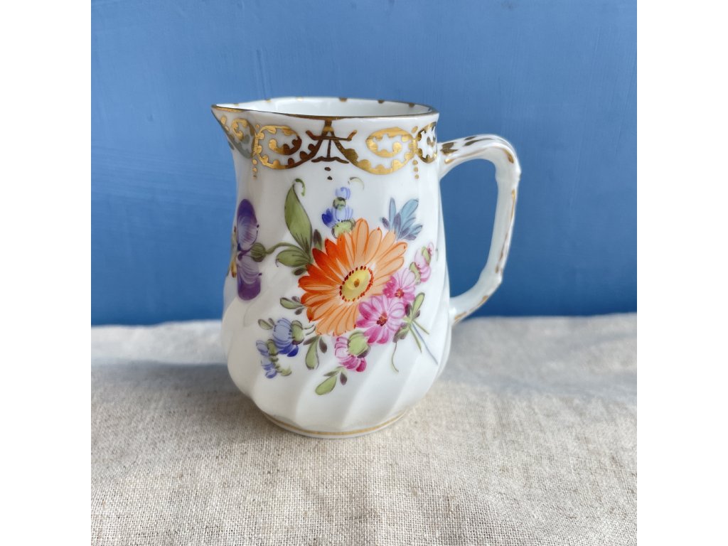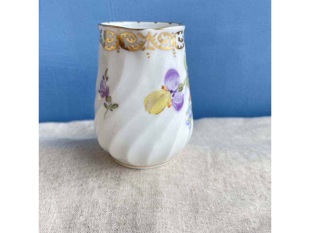 Porcelánová mlékovka elegantního, lehce kanelovaného tvaru, vyrobená z jemného bílého porcelánu a bohatě zdobená ruční polychromní malbou.