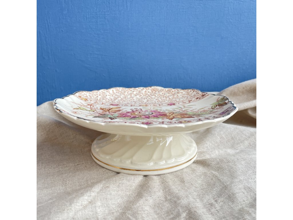 Nástolec působí dojmem starší anglické fajánse a zdobí jej bohatý botanický motiv v teplých odstínech růžové, hnědé a zelené.